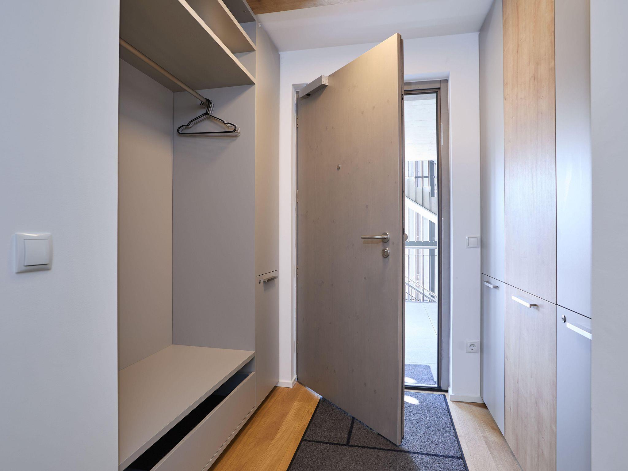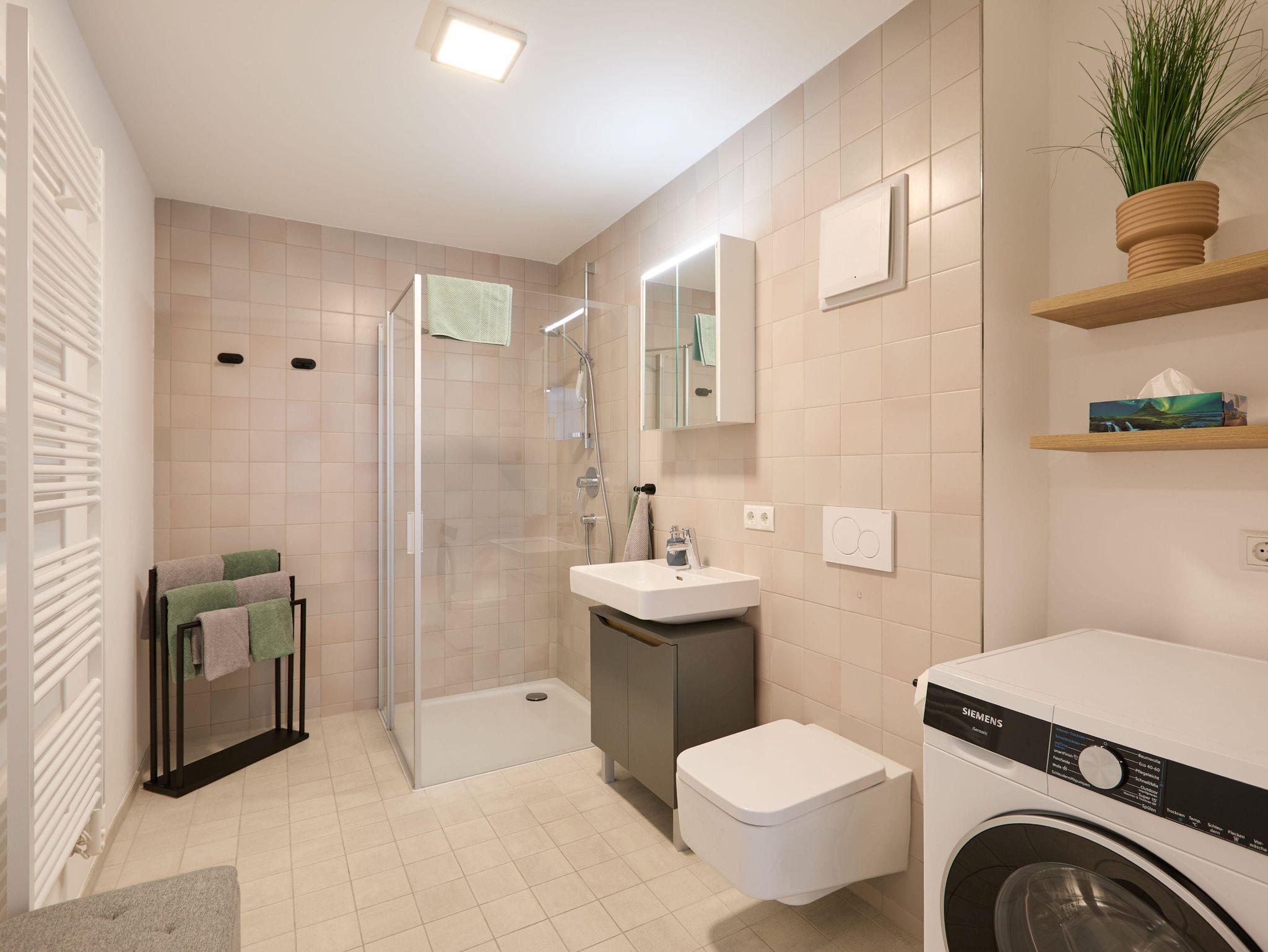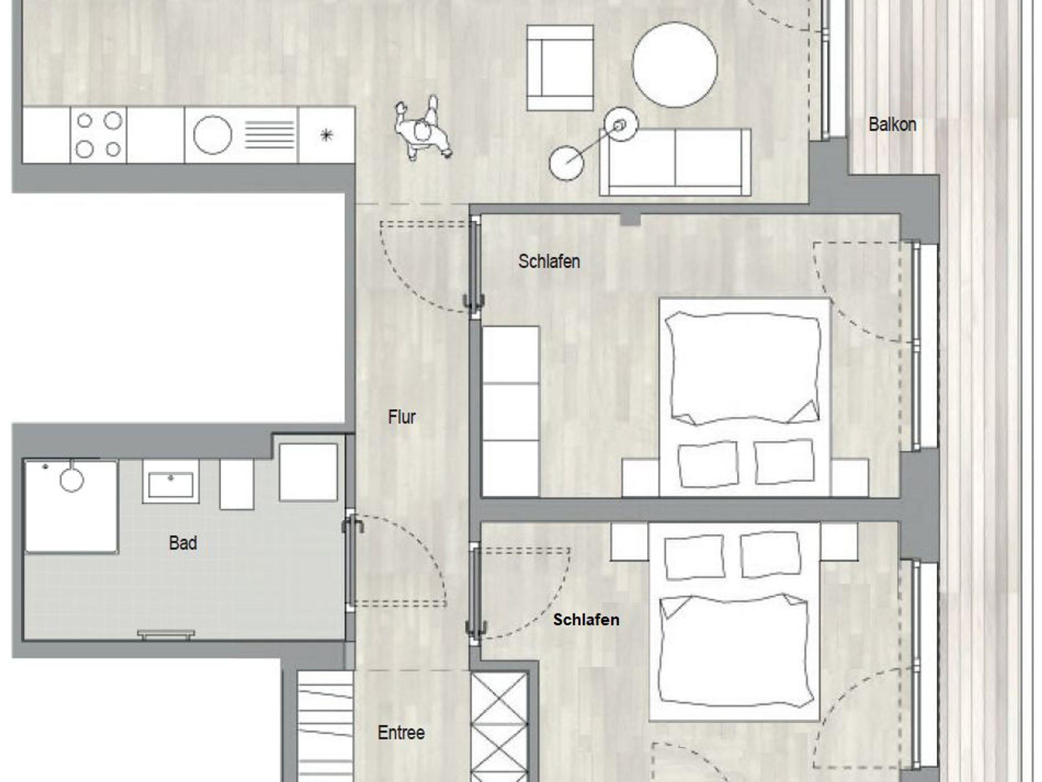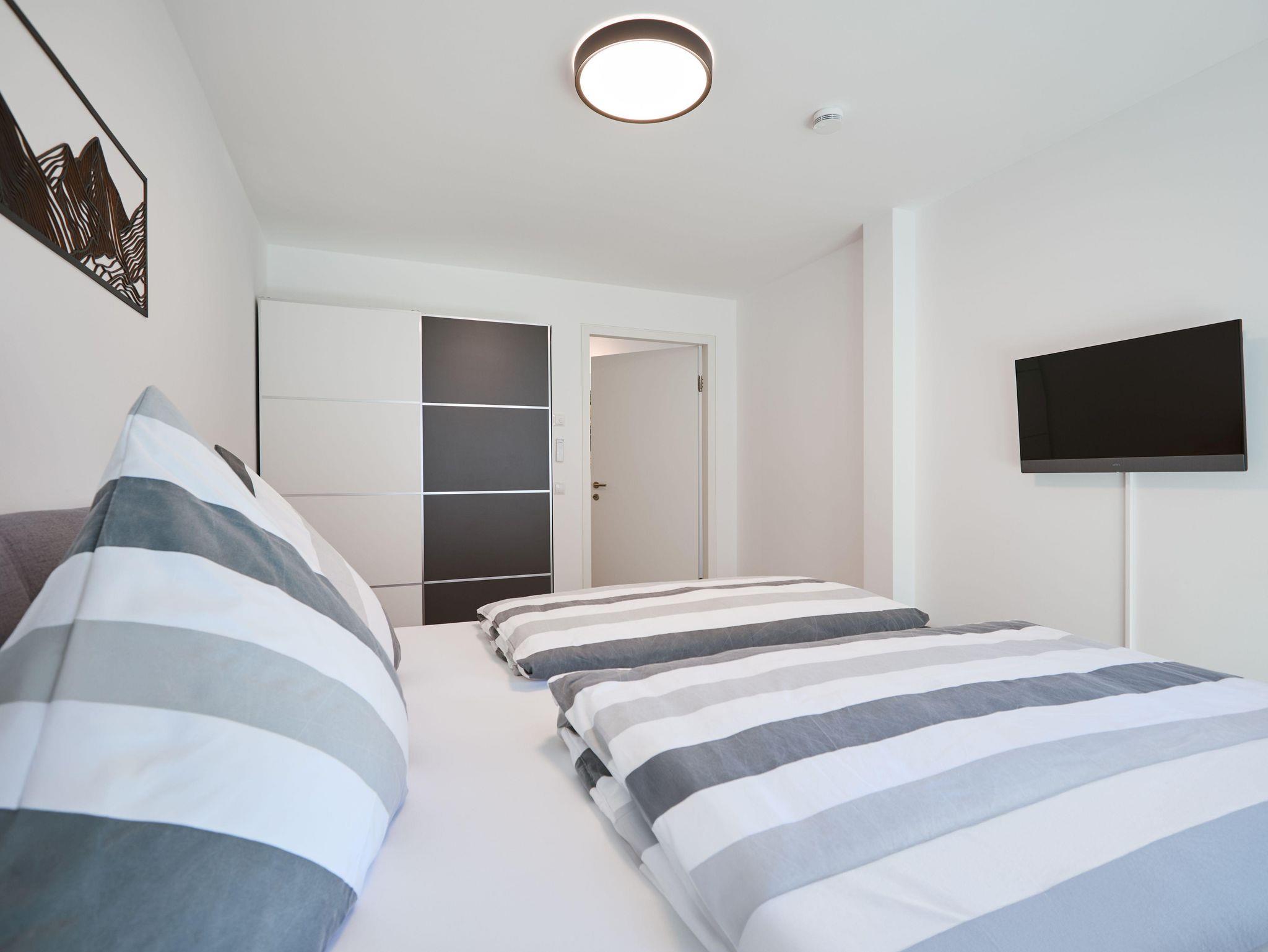 Komfortable, moderne Wohnung in der ersten Etage, im ökologischen Neubau mit Tiefgarage und Aufzug. Zwei separate Schlafzimmer mit Boxspringbetten, elektrischen Jalousien und Smart-TV in einem Zimmer. Freundlicher Wohnraum mit Couch/Schlafcouch, Smart-TV, großem Esstisch, Sitzbank und Stühlen. Hochwertige, komplett ausgestattete Wohnküche mit Induktionskochfeld und Bora Kochfeldabluft-System. Zugang zum möblierten Süd-Ostbalkon von allen Zimmern. Badezimmer mit WC, Waschbecken, bodengleicher Dusche und Wasch/Trockner.