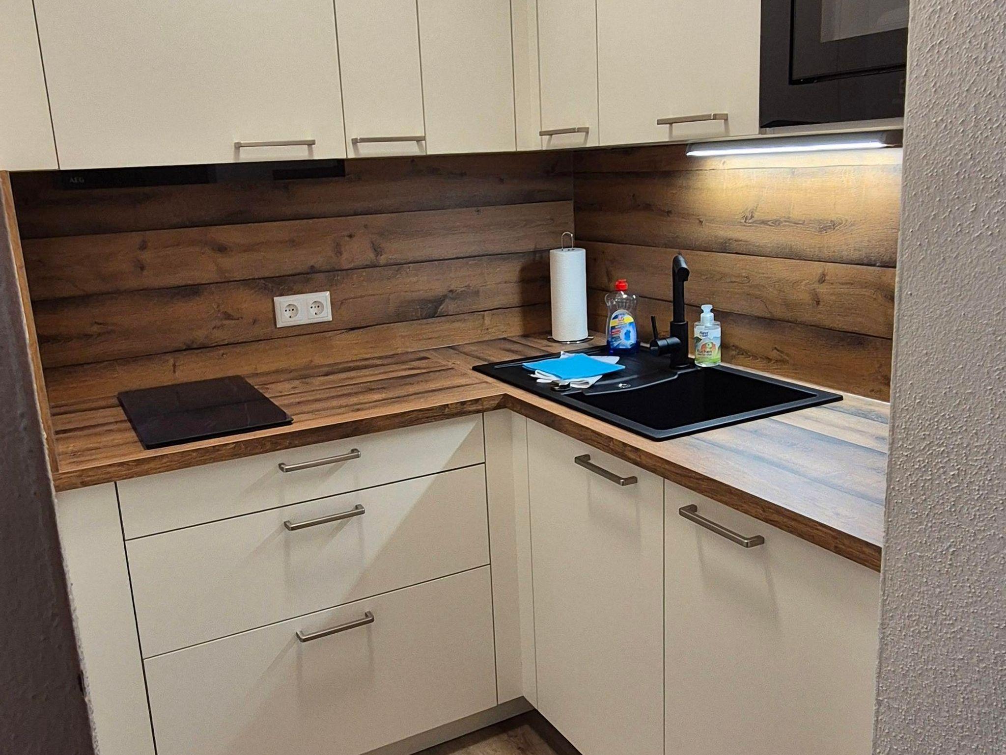 Die kleine Küche ist voll ausgestattet und bietet neben Kaffeemaschine, Wasserkocher, Eierkocher und Kühlschrank (inkl. TK - Fach) auch einen Herd (4 Platten Ceranfeld) inkl. Backofen. Selbstverständlich sind Töpfe, Pfannen, Geschirr und Besteck ausreichend vorhanden.