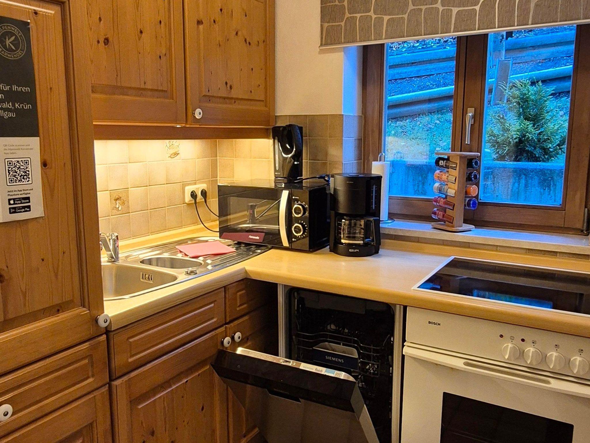 Die kleine Küche ist voll ausgestattet und bietet neben Kaffeemaschine, Wasserkocher, Eierkocher, Spülmaschine und Kühlschrank (mit TK - Fach) auch einen Herd (4 Platten Ceranfeld) inkl. Backofen. Selbstverständlich sind Töpfe, Pfannen, Geschirr und Besteck ausreichend vorhanden.