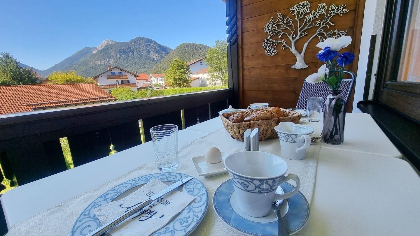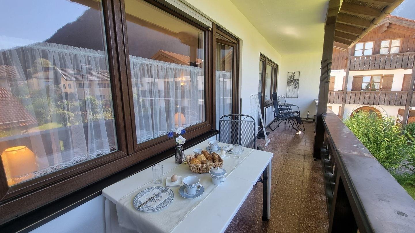 herrlich sonniger, möblierter Balkon mit Blick auf die Berge.