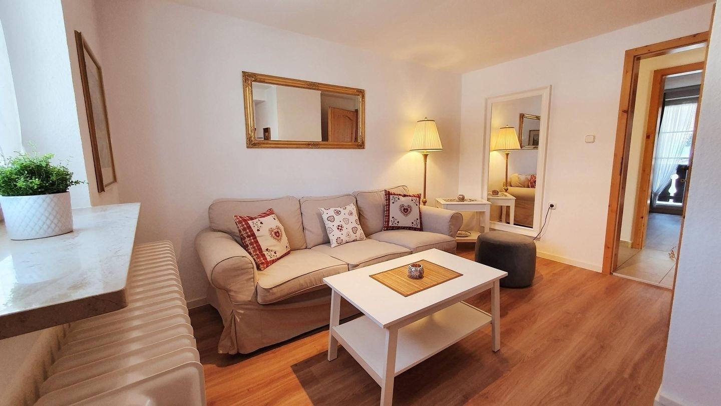 Helles Wohnzimmer, das zum Relaxen einlädt, mit Kabel-TV, Radio - CD Wechsler, bequemem Sofa und Sesseln.
