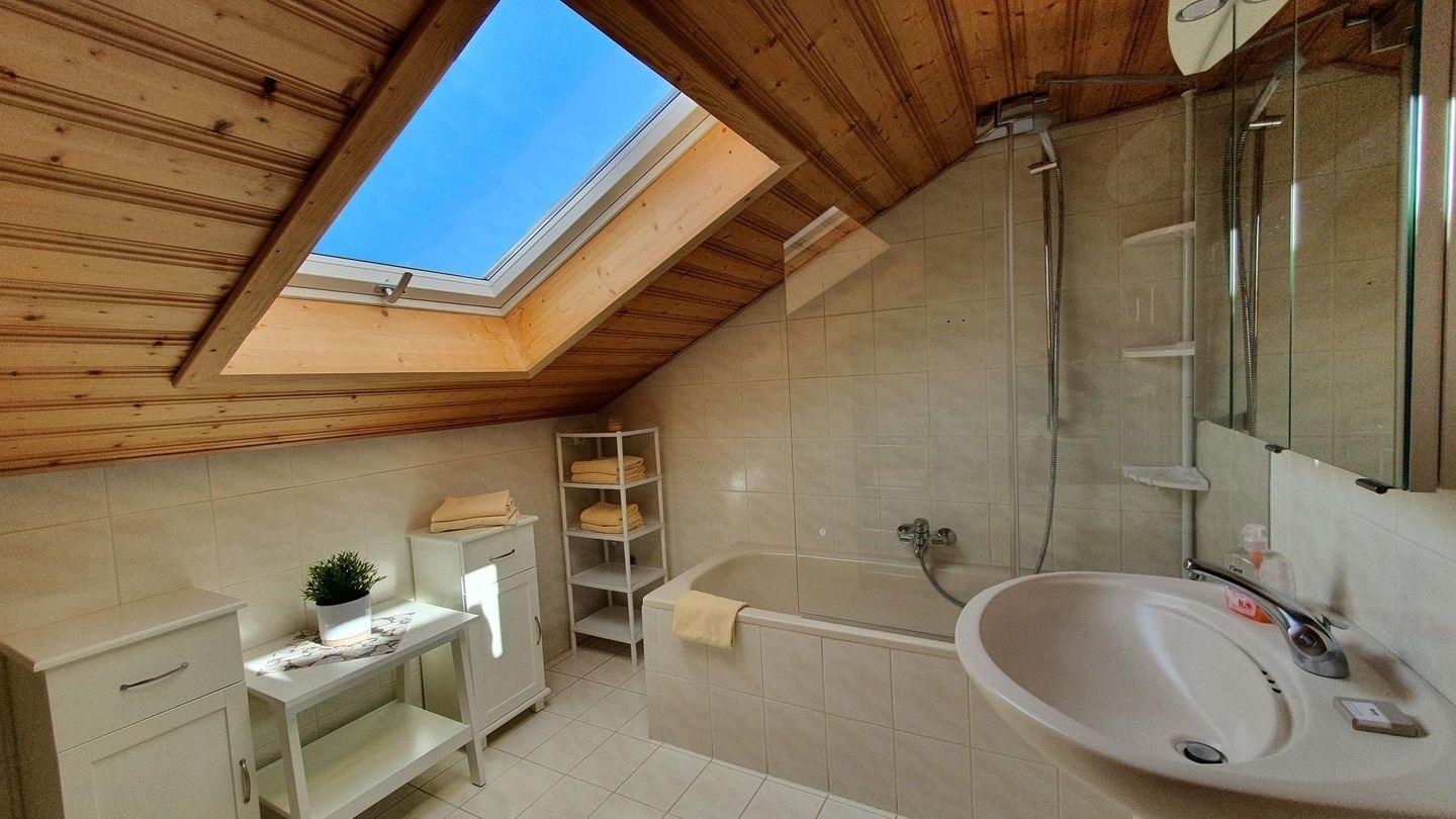Das Bad mit Fenster, verfügt über eine Badewanne und Duschwand und reichlich Schrankplatz. Das WC ist separat.