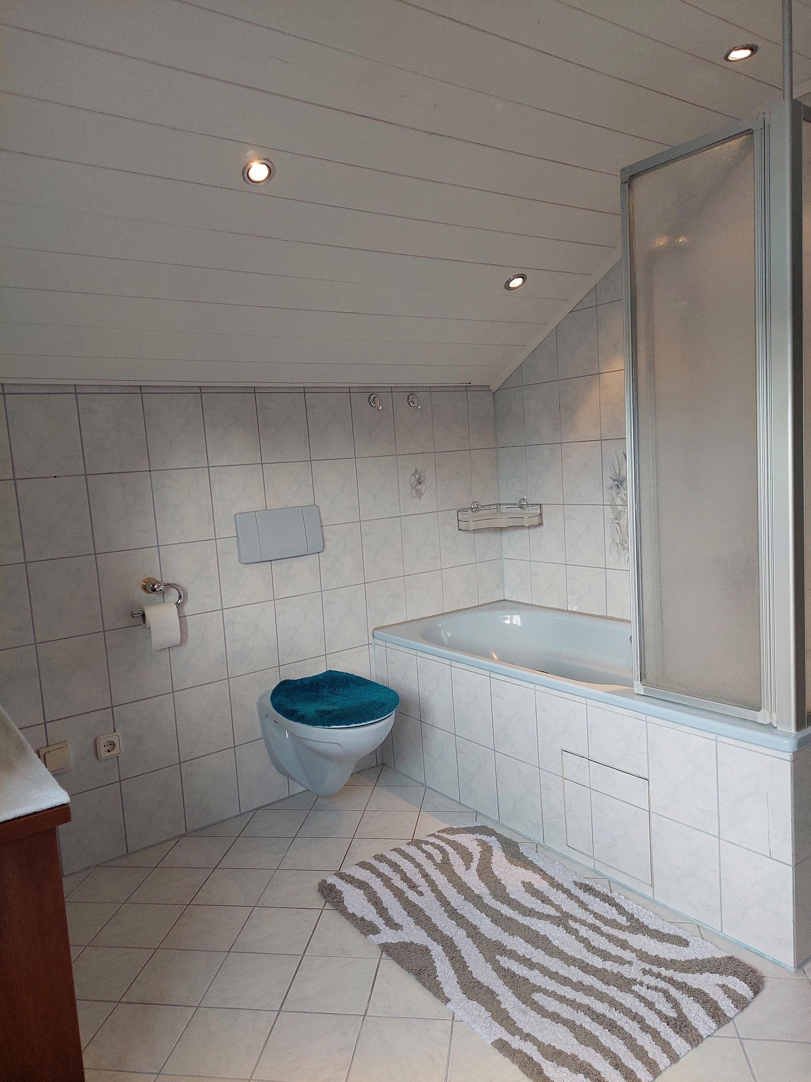 Badezimmer: Badezimmer mit Badewanne und Duschtrennwand.