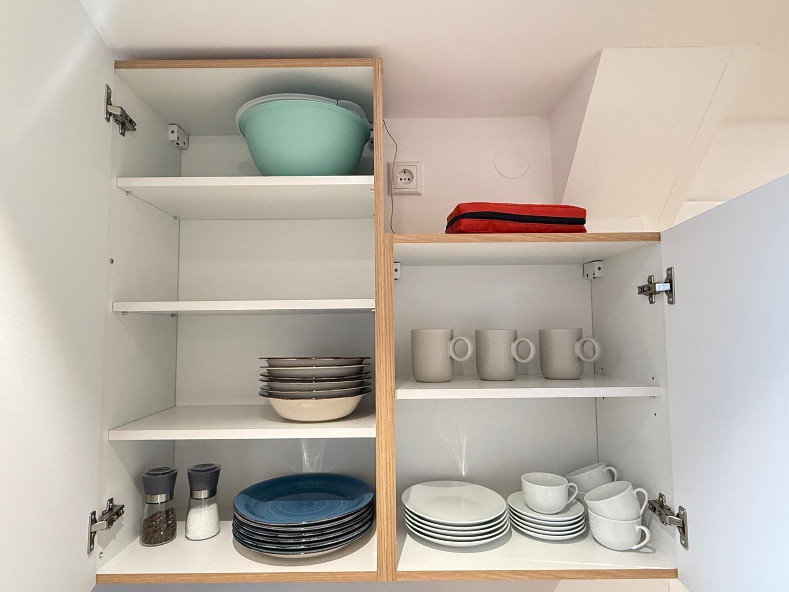 Der offene Wohn- und Essbereich lädt zum Verweilen ein: Hier können Sie gemeinsam essen, entspannen und den Blick ins Alpenpanorama genießen. Die Küche ist zweckmäßig ausgestattet und bietet alles, was Sie brauchen - statt eines klassischen Herds steht Ihnen ein moderner Minibackofen zur Verfügung, mit dem Sie genauso vielseitig kochen und backen können wie mit einem normalen Backofen. Keine Spülmaschine.