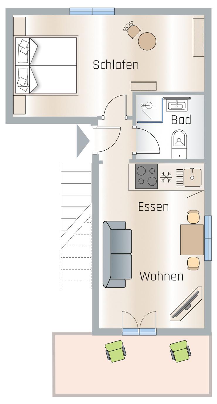 Die Wohnung ist über eine Treppe in das Obergeschoss vom Haupteingang des Hauses erreichbar. Sie verfügt über ein gemütliches Wohnzimmer mit funktionaler Kochnische. Hier befindet sich auch der Zugang zum Balkon mit einem tollen Blick zum Karwendelgebirge. Ein Esstisch, der Flachbild-TV, sowie gemütliche Sitzgelegenheiten runden das Angebot ab. Das Schlafzimmer mit einem Boxspringbett 160/200cm und Kleiderschrank zweigt vom Flur ab. Das Badezimmer mit DU/WC kann ebenfalls vom Flur aus erreicht werden. Für den PKW steht auf dem Hof unweit des Hauseingangs ein eigener Stellplatz zur Verfügung.