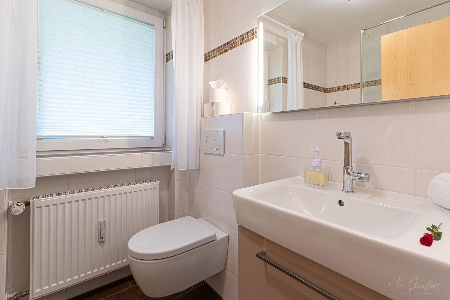 In der Fewo Karwendelspitzblick stehen Ihnen zwei Schlafzimmer zur Verfügung, die mit Vinylboden ausgelegt sind. Ein Schlafzimmer bietet Platz für ein Doppelbett, während im zweiten Schlafzimmer weitere Schlafmöglichkeiten für bis zu zwei Personen vorhanden sind. Die ruhige Lage und die gut gedämmten Fenster garantieren erholsame Nächte. Das helle Badezimmer zeichnet sich durch eine offene Dusche, ein WC, ein Waschbecken sowie einen Kosmetikspiegel aus.