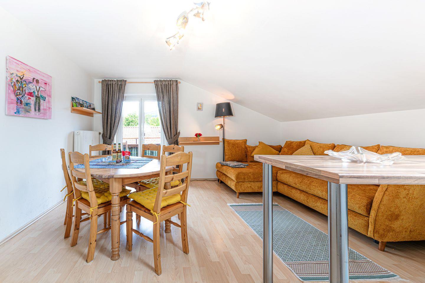 Mit zwei Schlafzimmern, einem schönen, offenen Wohn- und Küchenbereich, Bad mit Wanne und Dusche sowie einem Balkon mit toller Aussicht bietet diese teilrenovierte Fewo genug Platz für 5 Gäste.