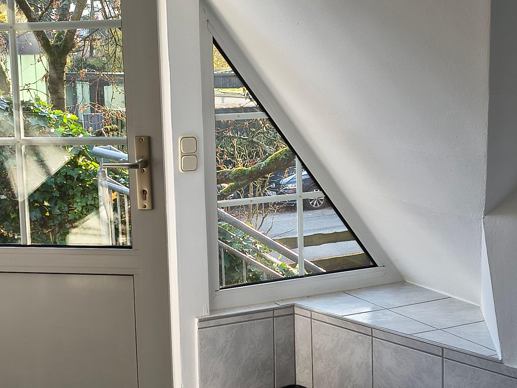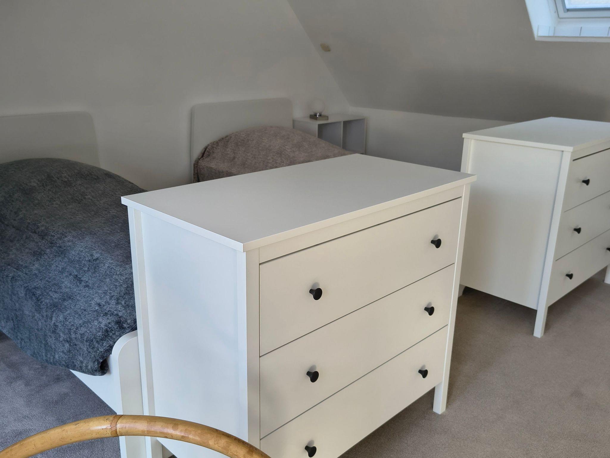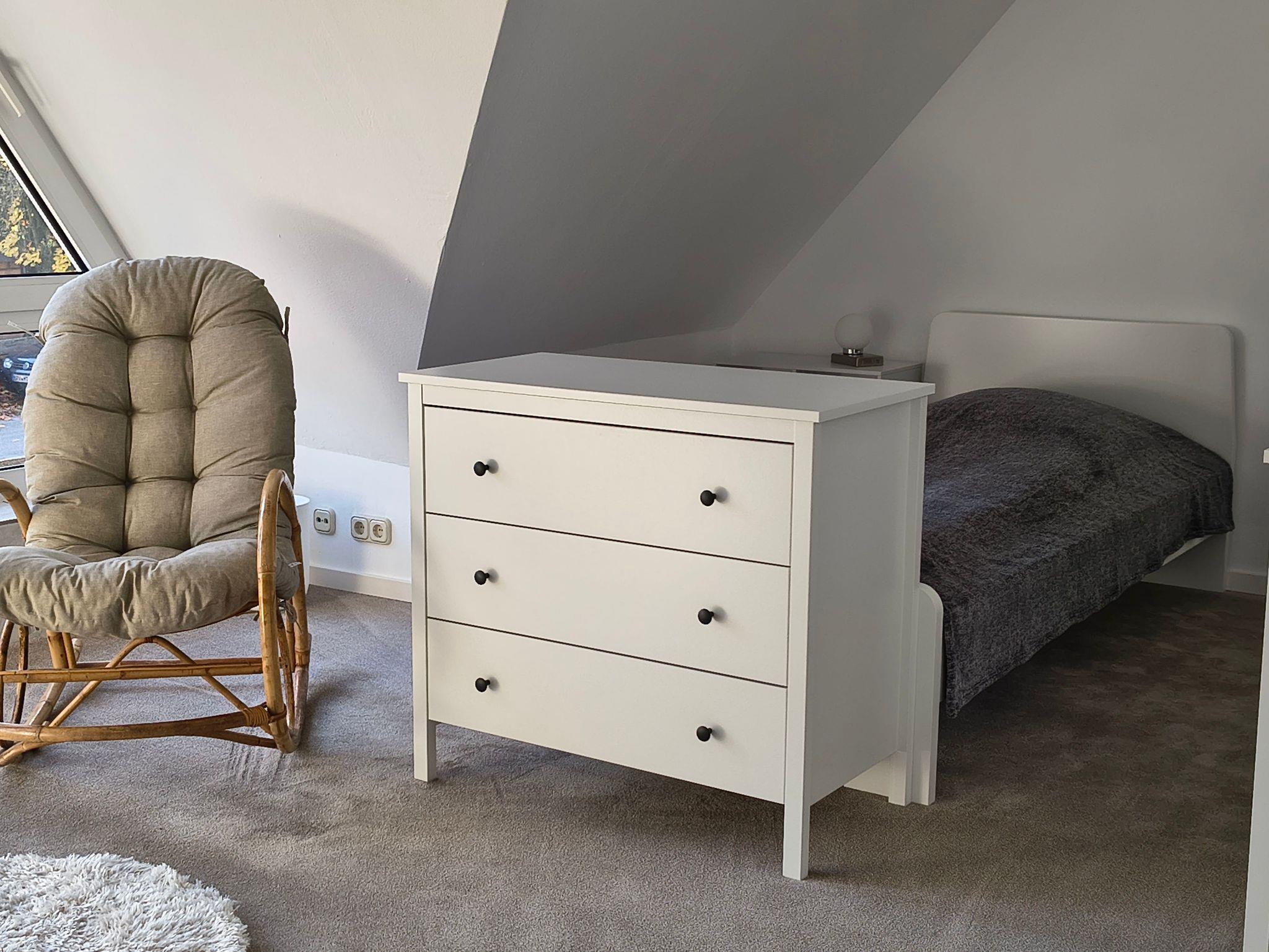 Die Wohnung ist praktisch, aber bequem im Dachgeschoss. Es gibt ein Schlafzimmer, in dem 1 bzw. 2 Personen schlafen können. Die Betten sind hygienisch sauber. Bettwäsche und Handtücher stehen immer zur Verfügung. Ein Schaukelstuhl lädt zum Lesen oder Relaxen ein. Für persönliche Sachen stehen je eine Kommode und ein Nachttisch mit eigener Lampe zur Verfügung. Das Bad steht allein den Gästen zur Verfügung und bietet neben der Dusche, eine Waschmaschine. In der Wohnung gibt es schnelles WLAN, einen Abstellraum mit Wäscheständer, Wischeimer, Staubsauger usw., der auch zum Unterstellen von Reisetaschen, Koffern o. ä. genutzt werden kann. Zudem findet sich eine Küchenzeile mit Geschirrspüler, Spülbecken, Kühlschrank mit Gefrierfach, Wasserkocher, Kaffeemaschine, Herd mit Backofen, Besteck, Geschirr, Gläsern, und Kochutensilien. Ein Tisch kann zum Essen oder als Arbeitsplatz genutzt werden. Im Flur findet sich eine große Garderobe mit geteiltem, offenem Kleiderschrank sowie viel Platz für Schuhe. Die Wohnung ist hell, warm und bietet Ruhe und Privatatmosphäre.