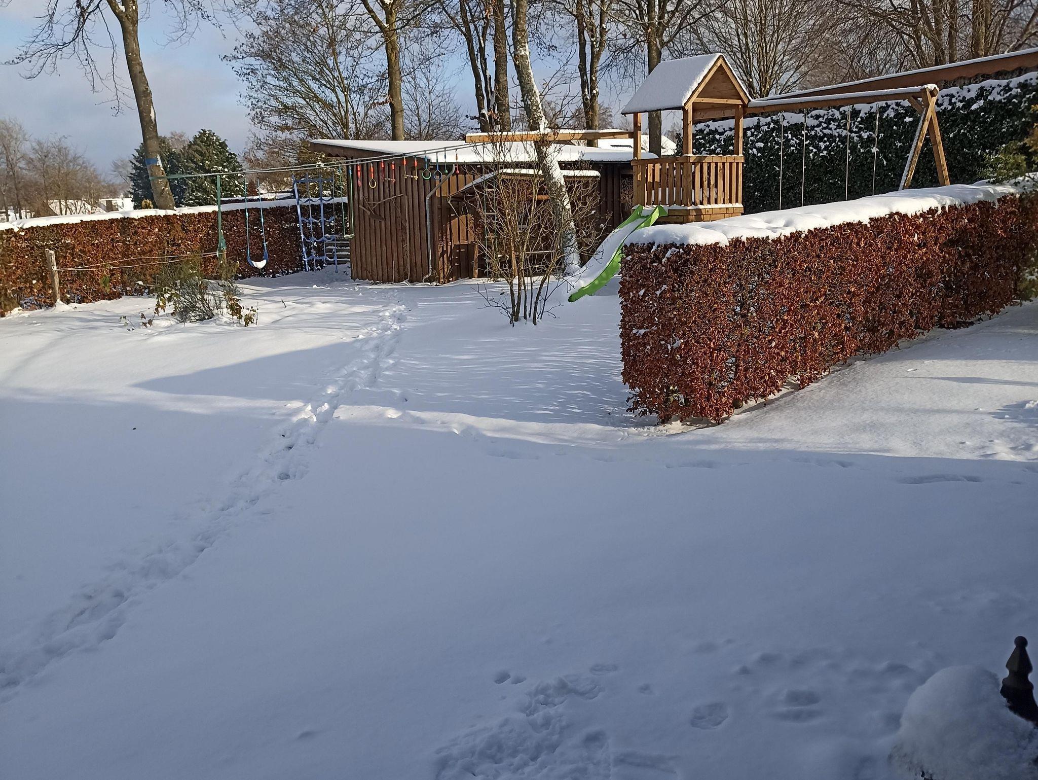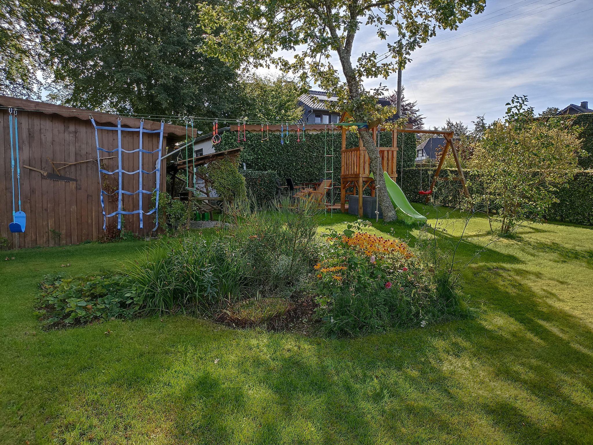 Wir haben unsere Wohnung Biebes - das heißt Schmetterling - genannt. Der Biebes ist das Wahrzeichen unseres Dorfes und wir bringen mit dem Namen unsere Verbundenheit mit unserem Heimatort zum Ausdruck. Zum Haus gehört ein großer Garten, der von unseren Gästen mitgenutzt werden kann. Wir pflegen unser Grundstück, lassen der Natur in einigen Bereichen aber auch ihren Raum, so dass uns im Sommer eine Vielzahl von echten Biebessen begegnen. Im Herbst sammelt ein Eichhornpärchen die Nüsse ein. Es gibt auch Räuber an unserem Haus, denn ein bis zwei Elsterpärchen nisten immer in den großen Buchen im Garten.