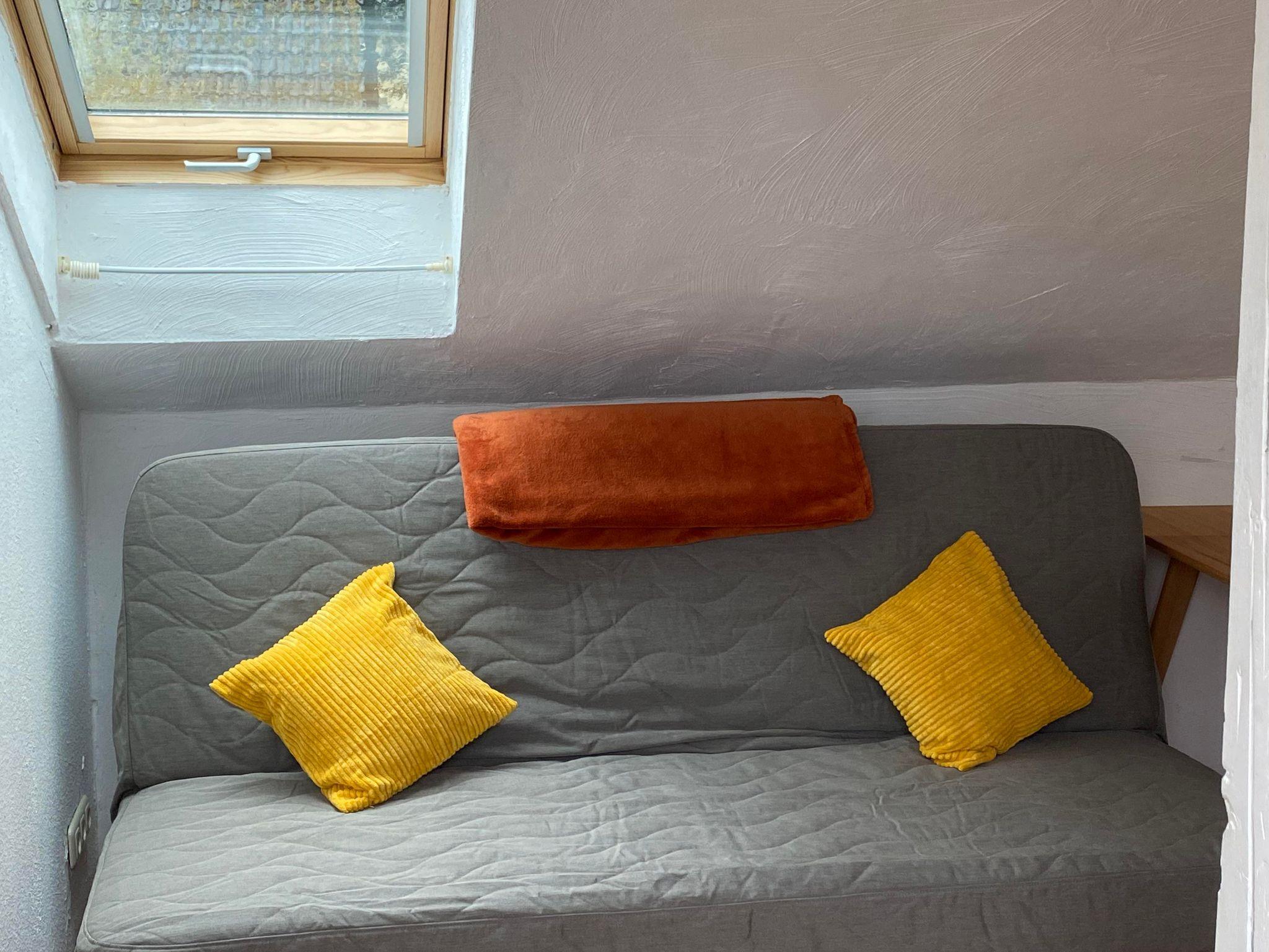 Im Wohnzimmer entspannen Sie auf einem großen, gemütlichen Sofa. Im Wohnzimmer stehen ein großer Fernseher und ein Schlafsofa mit den Maßen 1,40m mal 2 Meter mit Federkernmatratze.
