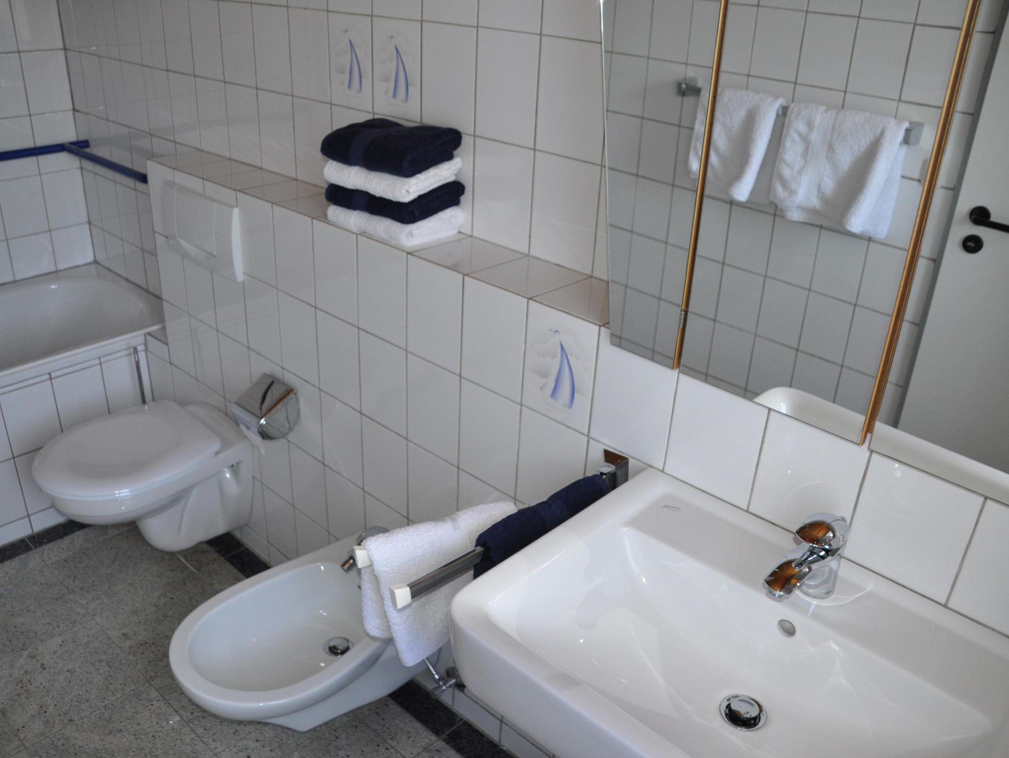 Das moderne Badezimmer ist mit (Dusch-)Badewanne mit Haltegriff, Waschbecken, WC und Bidet ausgestattet.