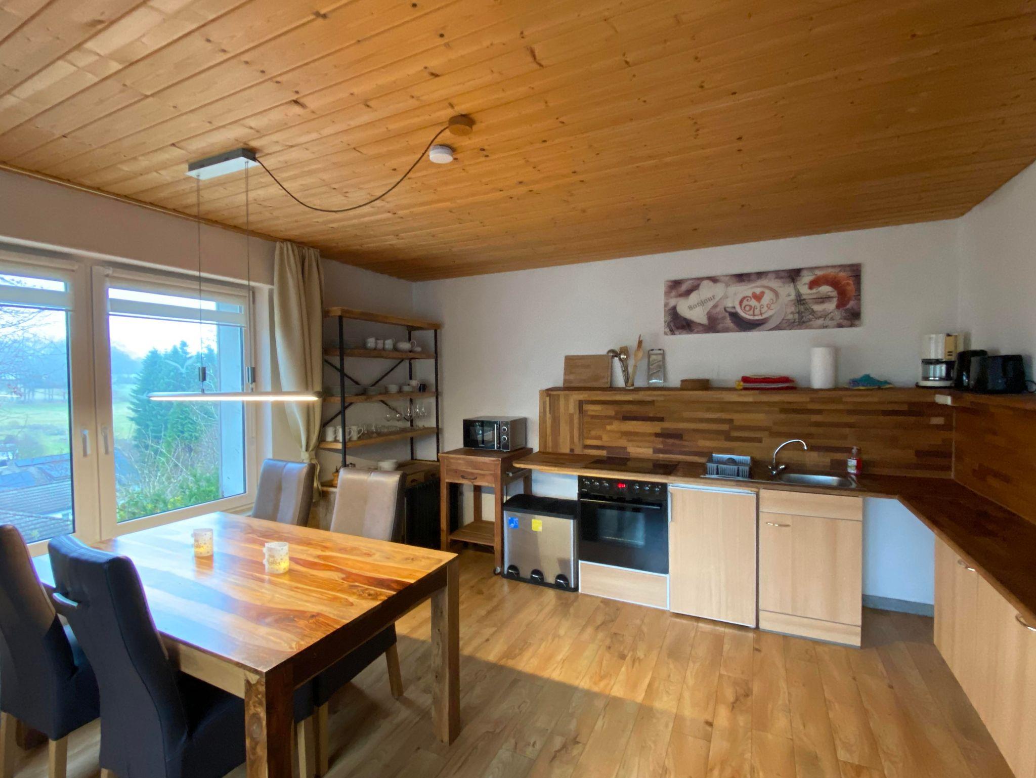 Ruhig im Grünen gelegen, hell und modern: Wander- und Waldwege, ein Supermarkt, Sternenpark und ein Spielplatz sind schnell erreichbar. Sonniger Balkon, Küche mit Herd und Backofen, ein Doppelzimmer plus ein Einzelbett, im Wohnzimmer schönes Sofa mit großem Fernseher und ein Schlafsofa mit Federkernmatratze für zwei Personen, Bad mit Dusche/Badewanne und Bidet.