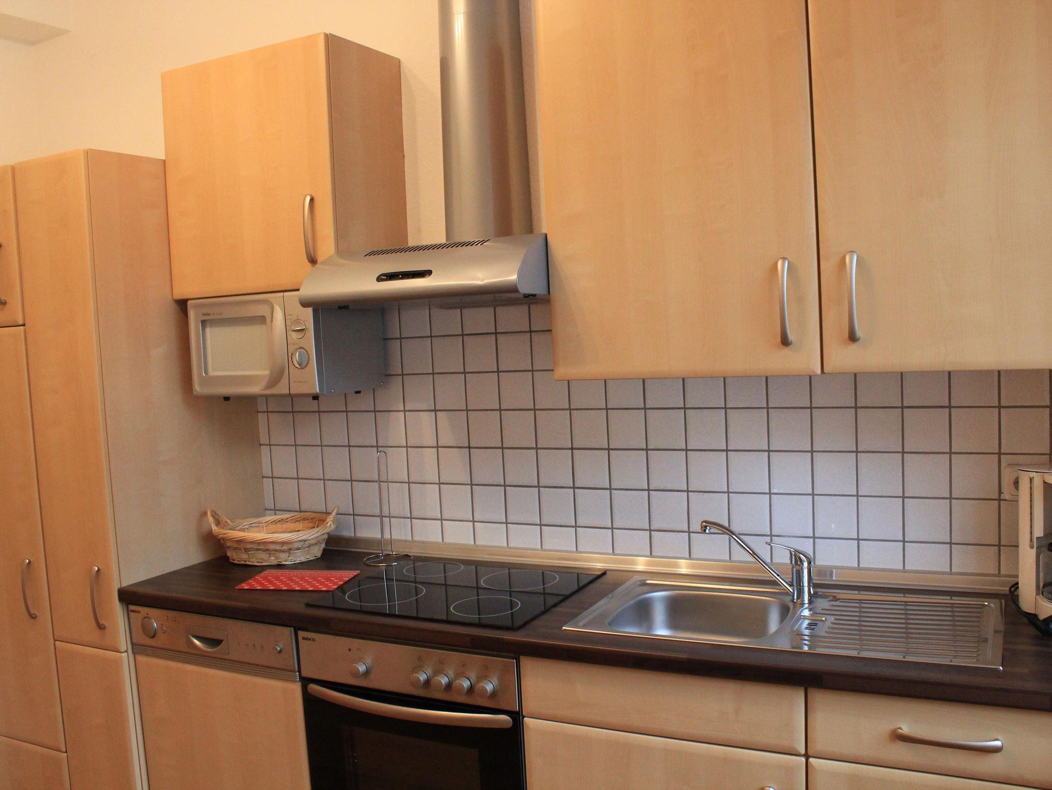 • Einbauküche mit Spülmaschine, Backofen, Mikrowelle, Kühlschrank mit Gefrierfach und Filterkaffeemaschine