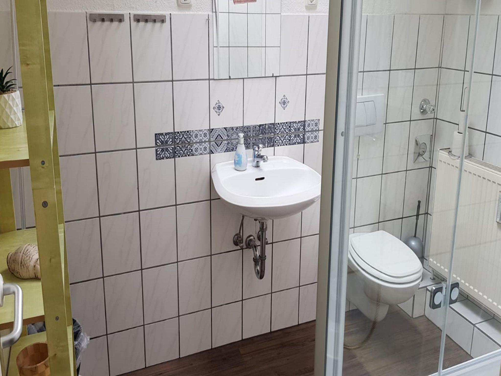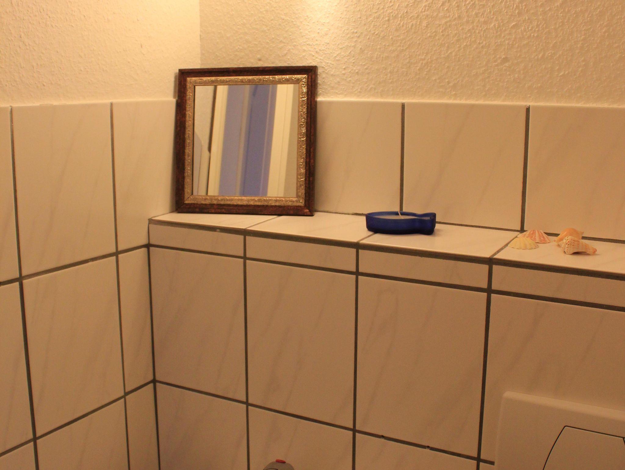Es gibt ein Bad mit WC, Waschbecken und Duschwanne. Zusätzlich gibt es ein WC mit Waschbecken.