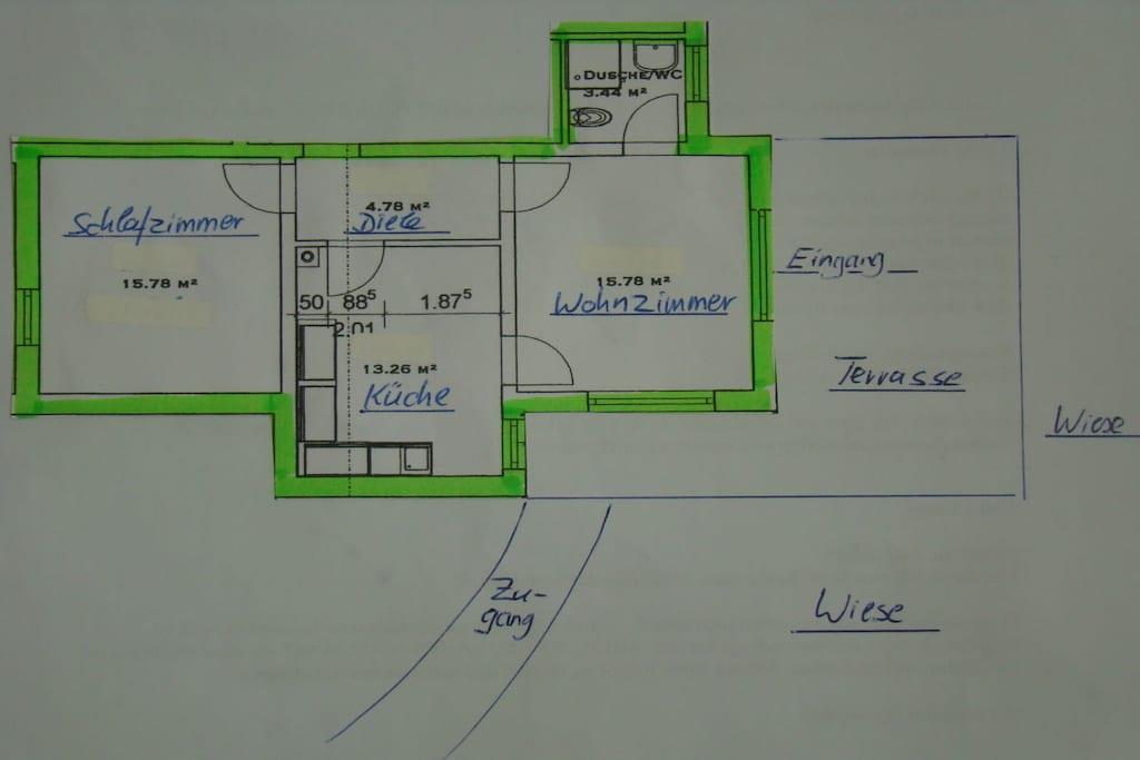 Stueetage: (entre, Køkken(spisebord, kogeplade, elkedel, brødrister, kaffemaskine, ovn, grill, mikrobølgeovn, opvaskemaskine , køleskab, fryser, barnestol), Stue/soveværelse(enkeltsovesofa, Fjernsyn, DVD-afspiller, radio), soveværelse(dobbeltseng, barneseng), badeværelse(bruser, håndvask, toilet, føntørrer, Håndklæder inkl., )) grill, terrasse, have, havemøbler, parkering, Parasol