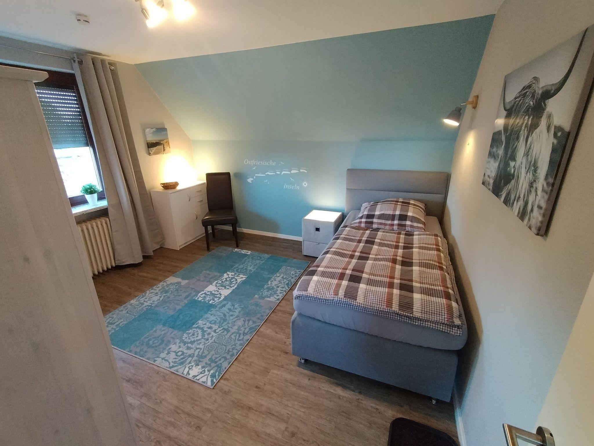 Großzügige Oberwohnung mit separater Küche mit Essbereich, Wohnzimmer mit Polstergarnitur und TV, Badezimmer mit Dusche und Badewanne, WC separat sowie drei Schlafzimmern. Ein Doppelzimmer mit zwei Einzelbetten, die aneinander oder getrennt gestellt werden können sowie zwei Einzelzimmer mit jeweils einem Einzelbett. Balkon mit Blick auf den Ems-Seitenkanal vorhanden. Eine Fahrrad-Abstellmöglichkeit ist gegeben. Maximal ein Hund (30 cm Schulterhöhe) erlaubt. Bitte beachten Sie, dass es sich um eine Oberwohnung mit Zugang über eine Treppe handelt.