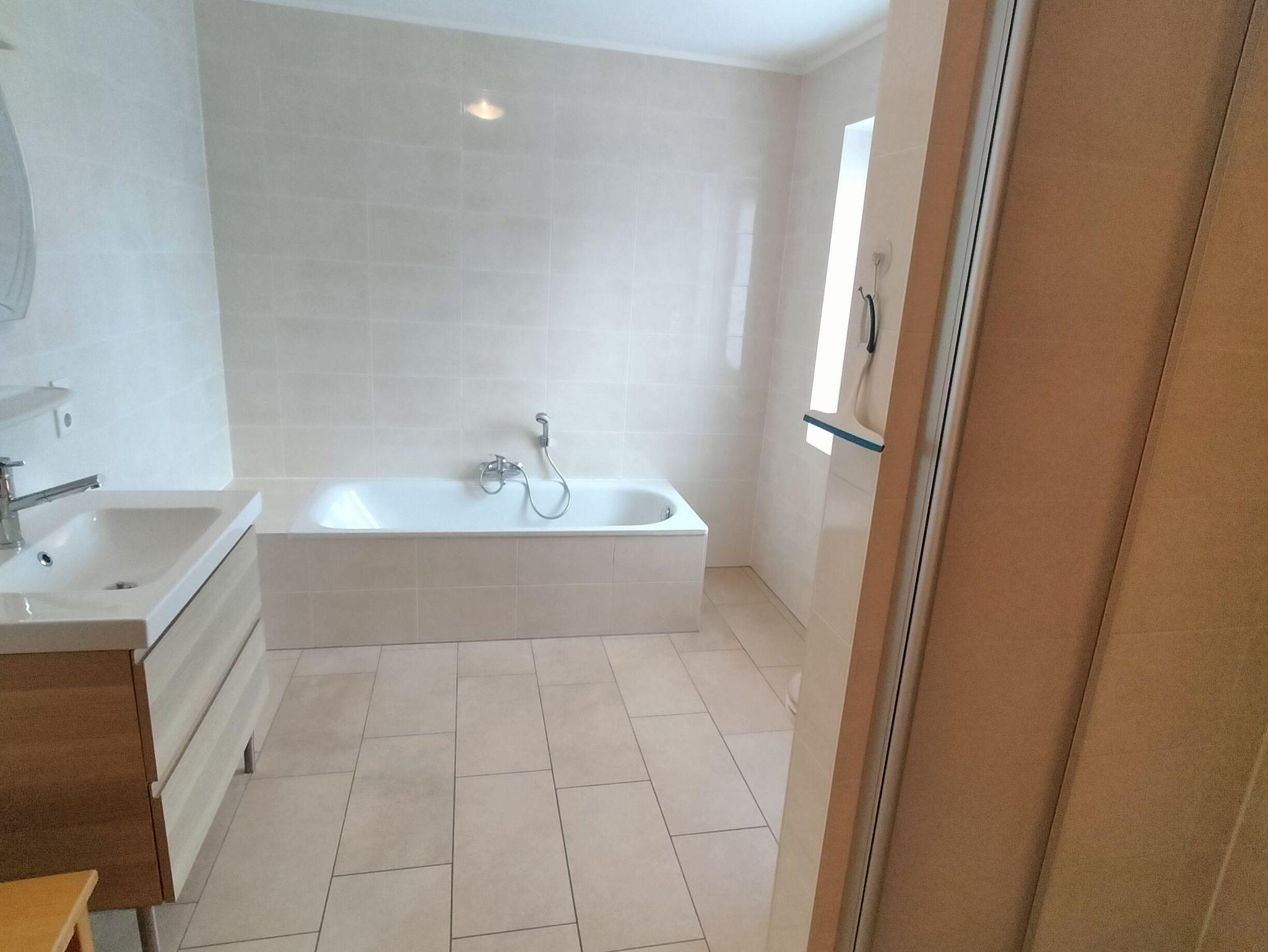 Badezimmer mit Dusche, Badewanne und WC, eine komplett ausgestattete Küche mit Essbereich und ein Wohnzimmer.