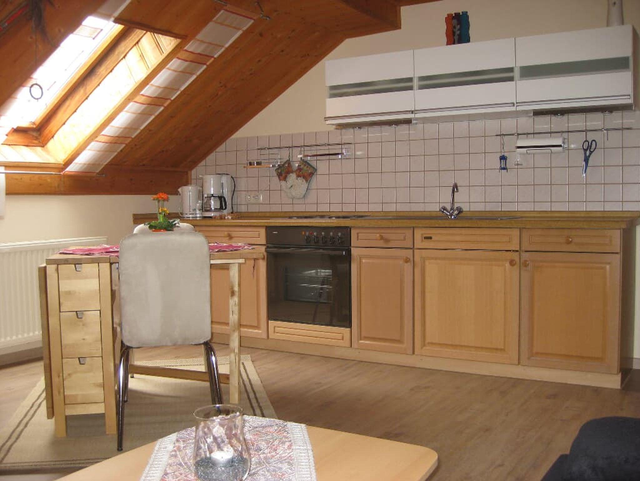 Unsere gemütliche Dachwohnung verfügt über ein Schlafzimmer, Bad mit Dusche/WC mit Hand- Badetücher Wechsel 1x wöchentlich, Wohnküche mit ausziehbarer Couch. Die Küche ist ausgestattet mit: Elektroherd,Backofen,Mikrowelle, Kaffeemaschine,Wasserkocher,Eierkocher, Toaster, Brotmaschine, Kühlschrank, Töpfe, Pfannen, Schüssel, Besteck, Geschirrtücher, Geschirr. Haustiere auf Anfrage. WLAN