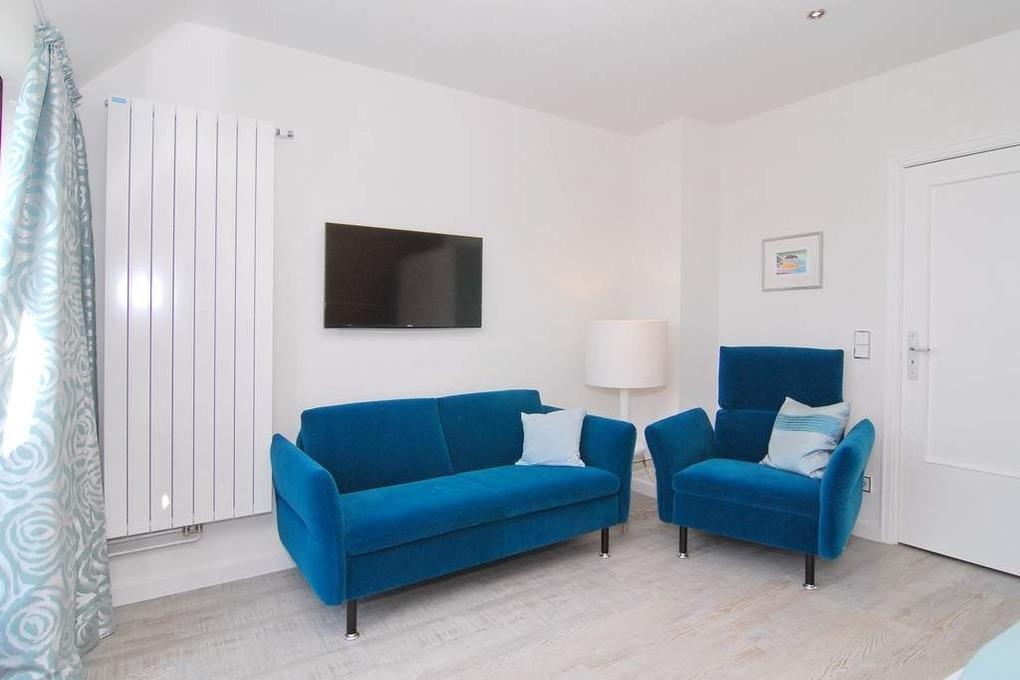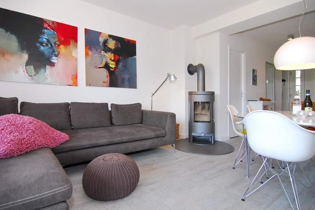 Exklusives Endhausteil, ca. 95 m², "Nichtraucher". EG: Wohnzimmer Sofaecke und Essplatz, Kamin-Ofen, Flat-TV, Stereoanlage, DVD, W-LAN vorhanden, Südterrasse mit Gartenmöbel und Markise, offene Küche mit Geschirrspüler, Backofen und Mikrowelle, Duschbad/WC mit Waschmaschine mit Trockner, Abstellraum. OG: kleines Schlafzimmer mit Doppelbett 160x200 und Einbauschrank und kleinem Flat-TV, großes Schlafzimmer mit Doppelbett (200x200), Flat-TV, Sofa, Sessel und Südbalkon, Duschbad/WC. DG mit Doppelbett (160x200 ) an der Schräge und Flat-TV. Tierhaltung ist nicht gestattet. PKW-Stellplatz am Haus. Bettwäsche und Handtücher sind zur Anreise aufgezogen.