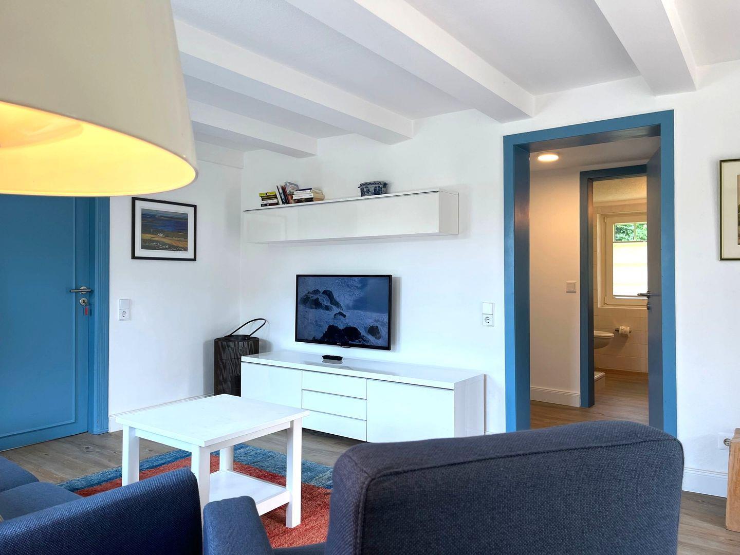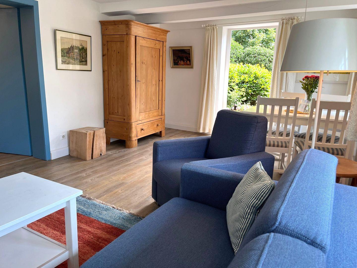 Das helle, im März 2020 renovierte Appartement "Ost" hat einen großen Wohnraum mit Ausgang zur eigenen Terrasse in Süd-Ost Lage. Auf dieser lässt es sich morgens wunderbar frühstücken, da diese durch den historischen Friesenwall sowohl vor neugierigen Blicken, als auch vor dem Wind schützt. Eine gemütliche Sitzecke mit Couch und Sessel, sowie einem Esstisch für 4 Personen laden zum Verweilen ein, der historische Kiefernschrank strahlt Behaglichkeit aus. Das Sofa ist ein bequemes Schlafsofa. Die separate Küche mit Backofen und Geschirrspüler ist voll ausgestattet und wurde erst in 2022 erneuert. Das Schlafzimmer hat ein großes Doppelbett und eine Kommode.