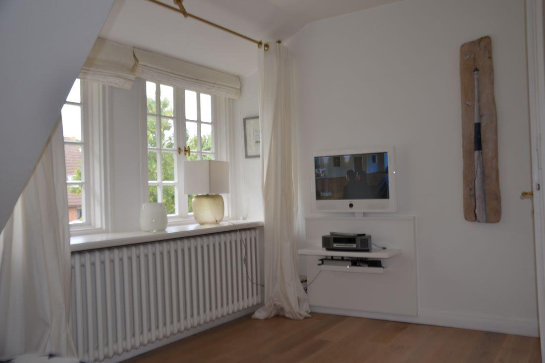 Wohnzimmer hell und geschmackvoll eingerichtet, ausgestattet mit LCD Flat TV und offenem Kamin.