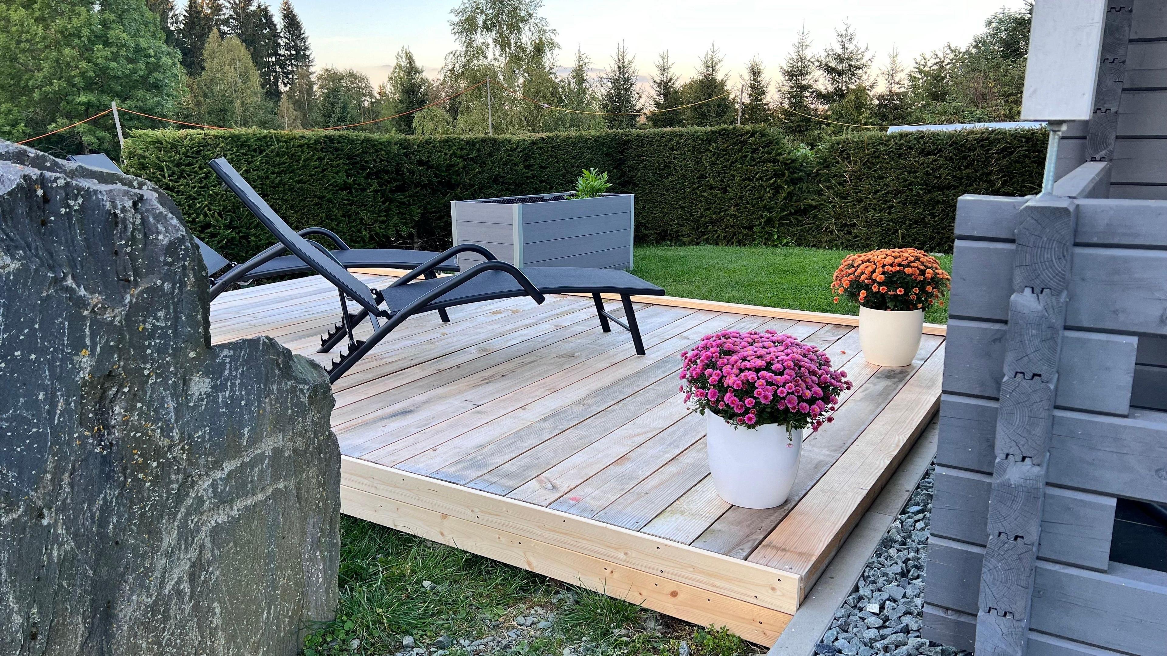 2023 NEUE ZUSÄTZLICHE TERRASSE seitlich am Haus mit 2 Liegestühlen ausgestattet.