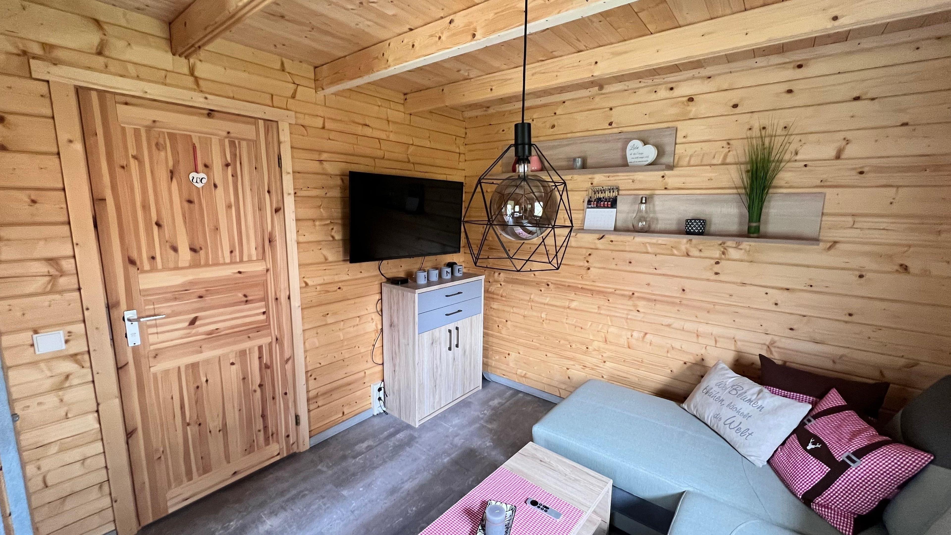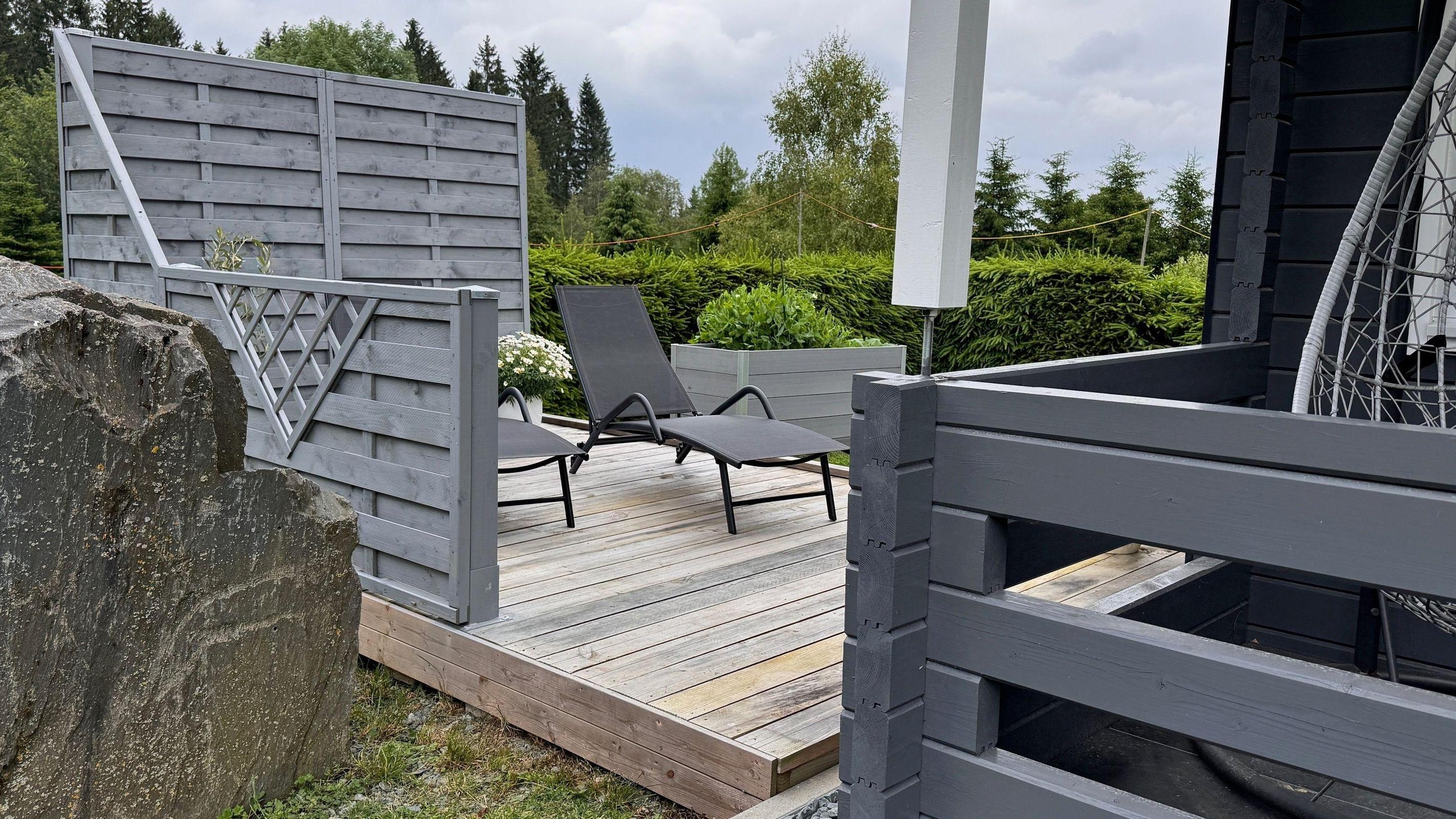 Unser Häuschen bietet eine Terrasse mit Hängstuhl zum entspannen oder lesen und eine Sitzecke für gemütliche Abende am Grill, den wir zur Verfügung stellen.