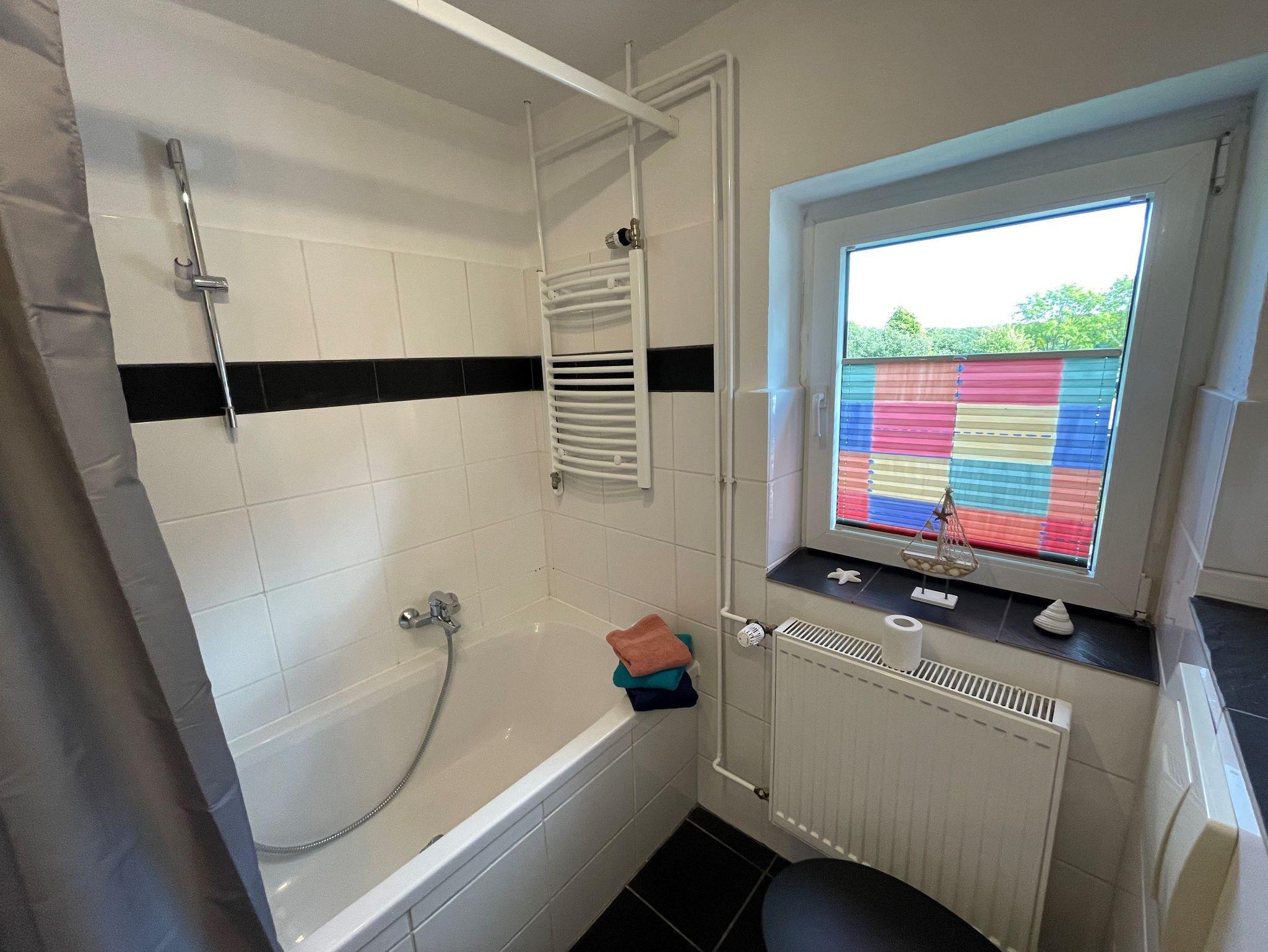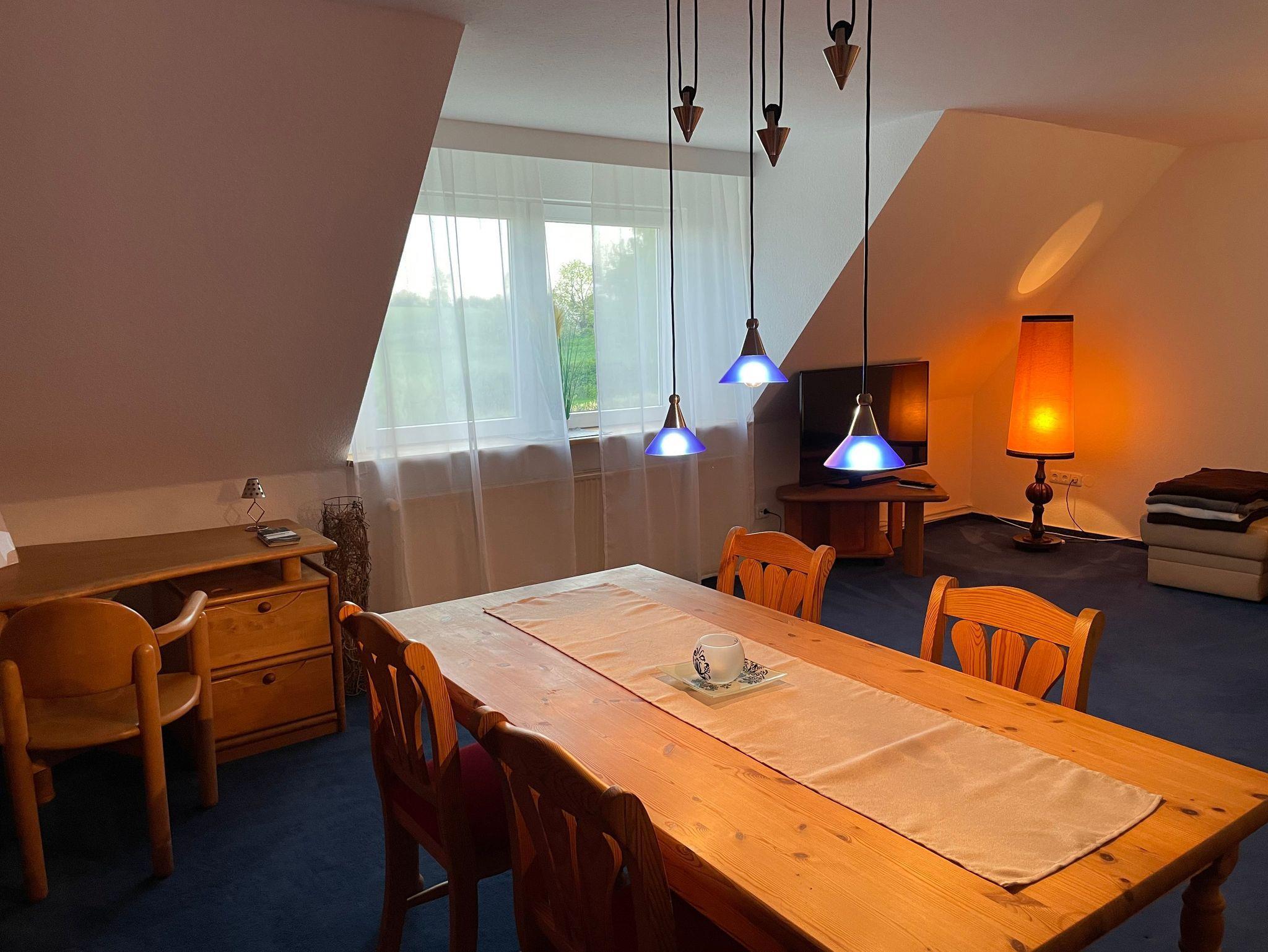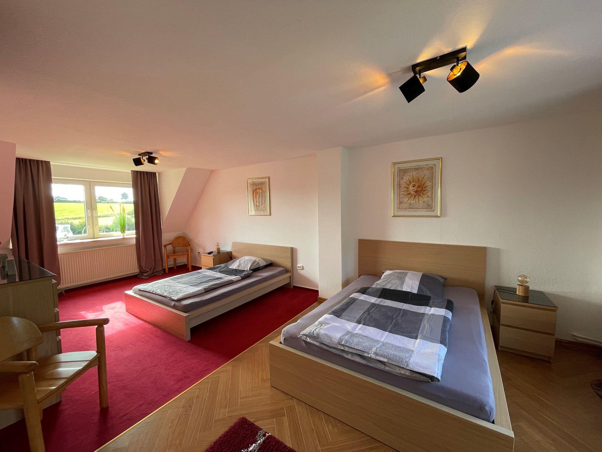 Großzügige Ferienwohnung (115 m²) auf dem Lande, nur 1,5km von der Ostsee entfernt. Die Wohnung liegt im 1. Stock und besteht aus einem Schlafzimmer mit Doppelbett (2,00 x 2,00m) und einem Schlafzimmer mit zwei großen Einzelbetten (1,40 x 2,00m), einem großen Wohnzimmer mit gemütlicher Sitzgruppe und einem Esstisch, einer kleinen Küche mit voller Ausstattung und einem Bad mit Duschwanne. Ein Waschtrockner steht kostenlos zur Verfügung.