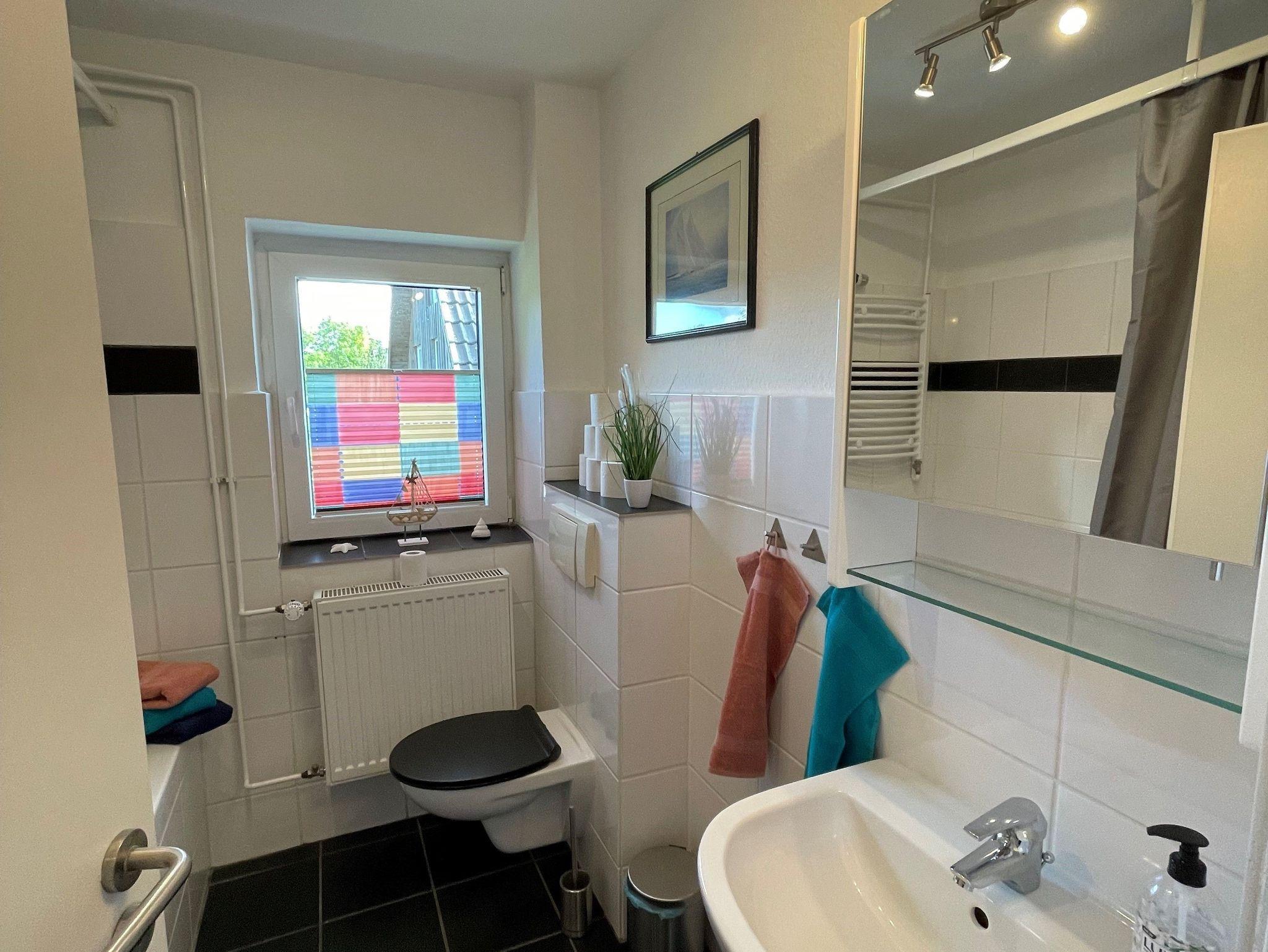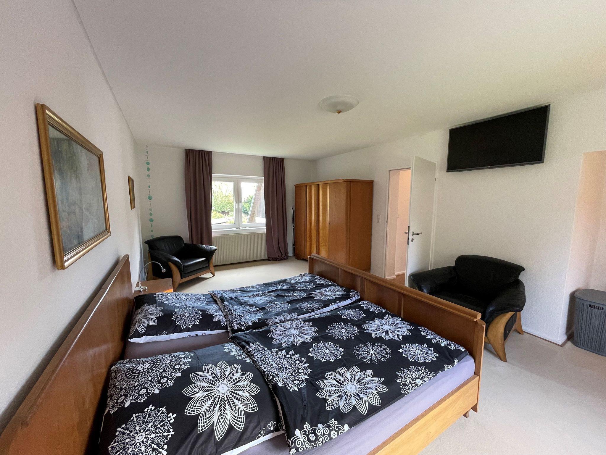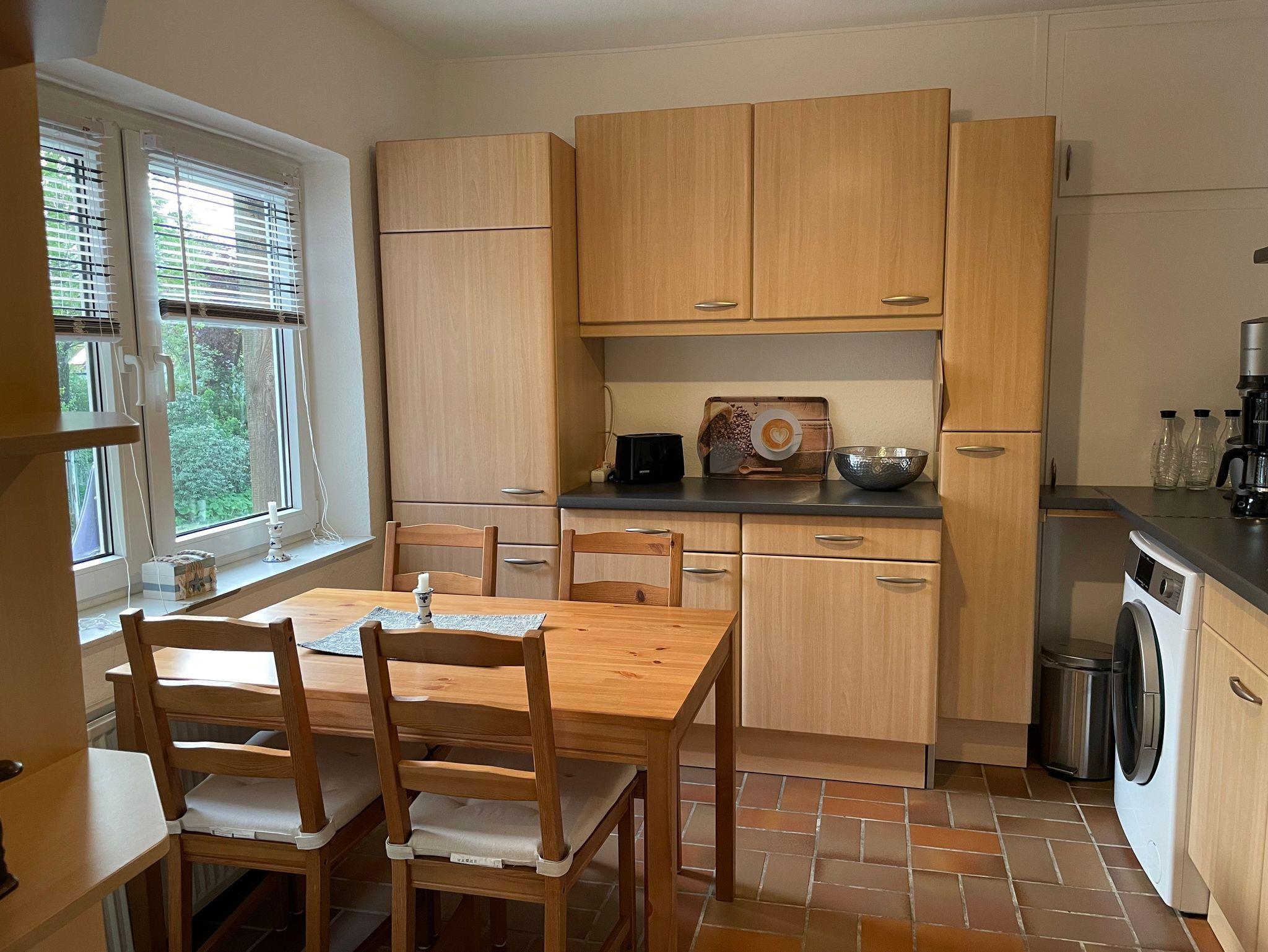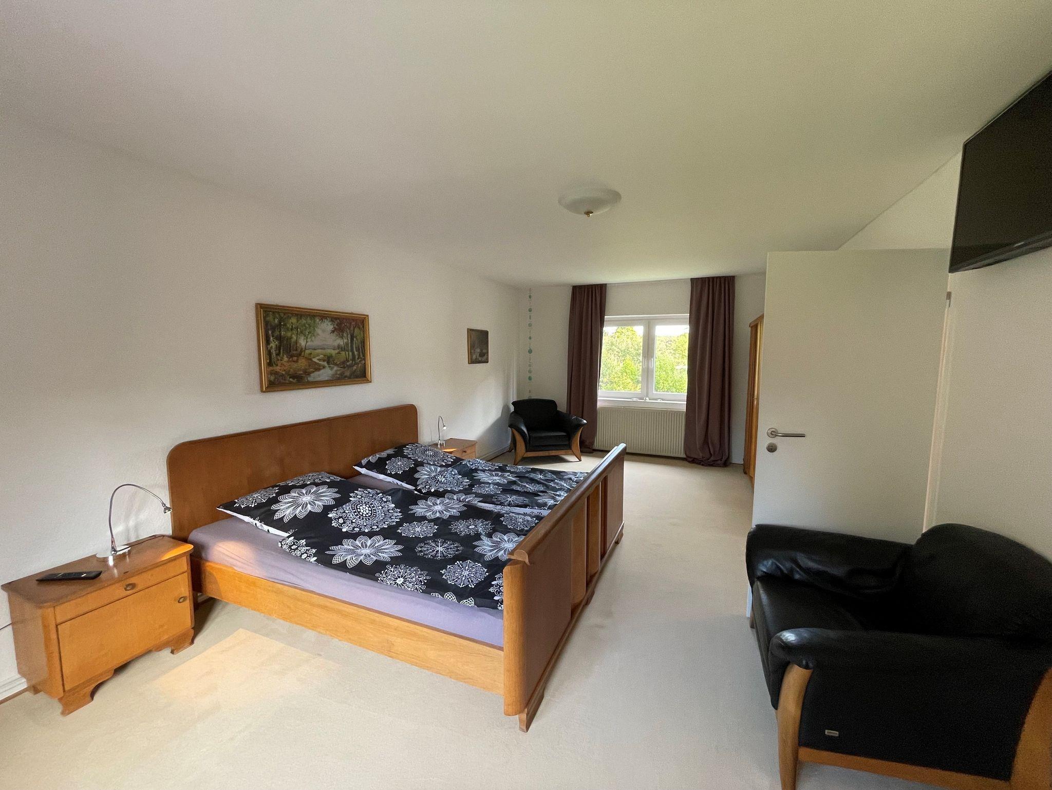 Großzügige Ferienwohnung (115 m²) auf dem Lande, nur 1,5km von der Ostsee entfernt. Die Wohnung liegt im 1. Stock und besteht aus einem Schlafzimmer mit Doppelbett (2,00 x 2,00m) und einem Schlafzimmer mit zwei großen Einzelbetten (1,40 x 2,00m), einem großen Wohnzimmer mit gemütlicher Sitzgruppe und einem Esstisch, einer kleinen Küche mit voller Ausstattung und einem Bad mit Duschwanne. Ein Waschtrockner steht kostenlos zur Verfügung.