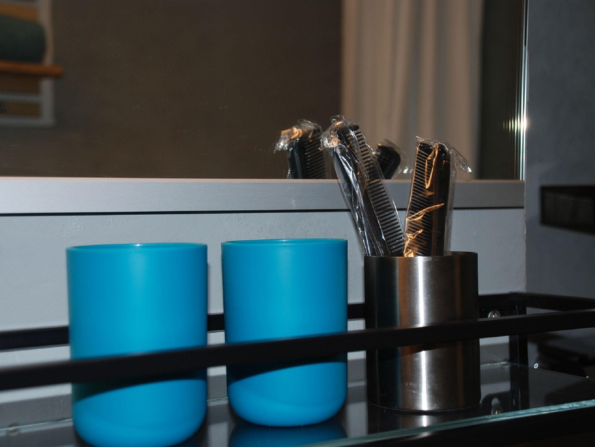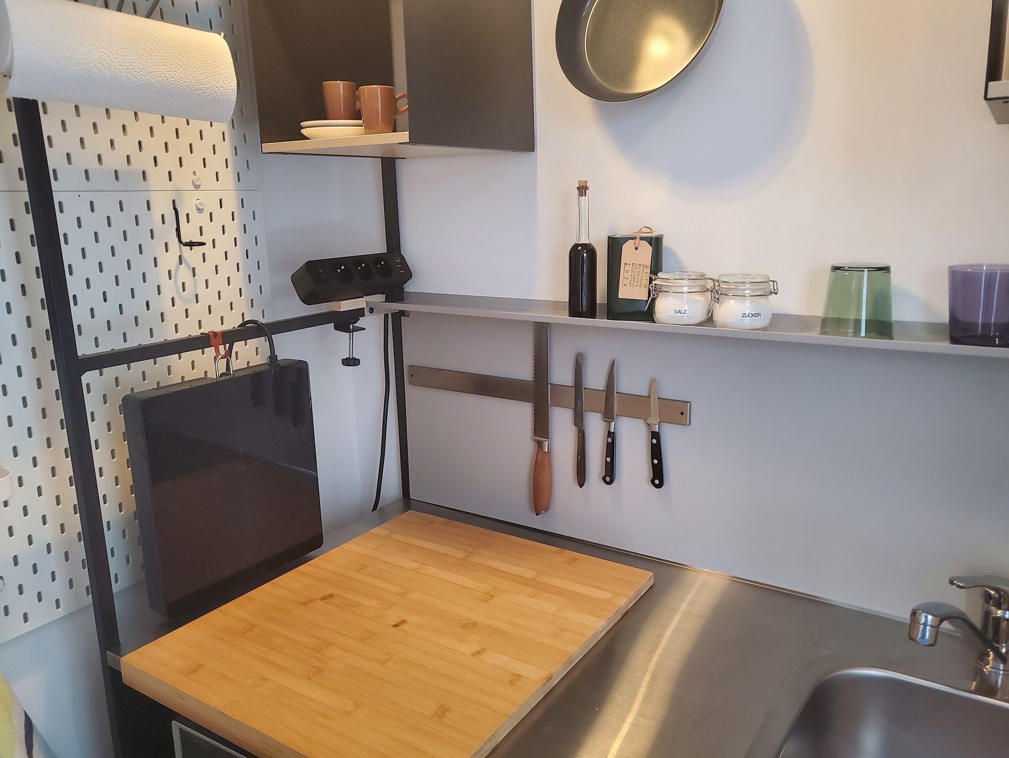 Die gut ausgestattete Pantryküche verfügt über eine Mikrowelle, ein mobiles Induktionskochfeld, Wasserkocher, Toaster, Geschirr, Gläser und Snacks. Eine Lavazza-Kaffeemaschine mit Kapseln sowie ein gefüllter Weinkühlschrank stehen ebenfalls bereit. Das moderne, innenliegende Bad ist mit Dusche, WC, Haartrockner, großem Spiegel und Pflegeprodukten ausgestattet und verfügt über eine blendfreie Beleuchtung sowie Belüftung.