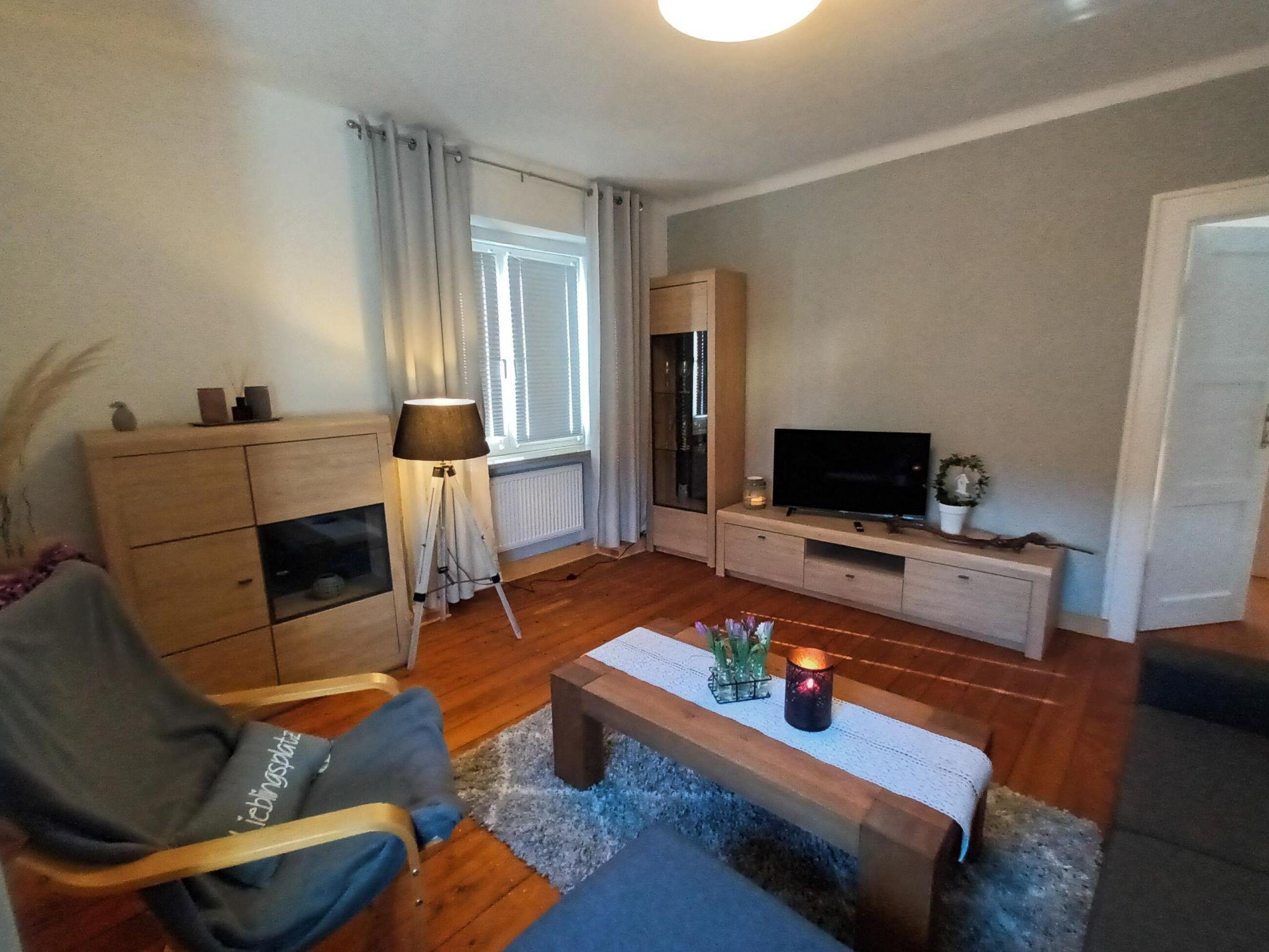 Wir bieten eine gemütliche Ferienwohnung (54 m²) für 4 Personen im 1. OG. Die Küche ist eingerichtet mit Geschirrspüler, Cerankochfeld, Backofen, Kühlschrank, Gefrierfach, Mikrowelle, Toaster, Wasserkocher, Kaffeemaschine, SodaStream, Geschirr und Esstisch. Das Wohnzimmer ist ausgestattet mit Schlafsofa, TV mit Alexa Funktion und kostenlosem Netflix Zugang. Im Schlafzimmer befindet sich ein Doppelbett (180x200). Das Badezimmer ist ausgestattet mit Badewanne mit Duschwand, Fön & Handtuchheizung.