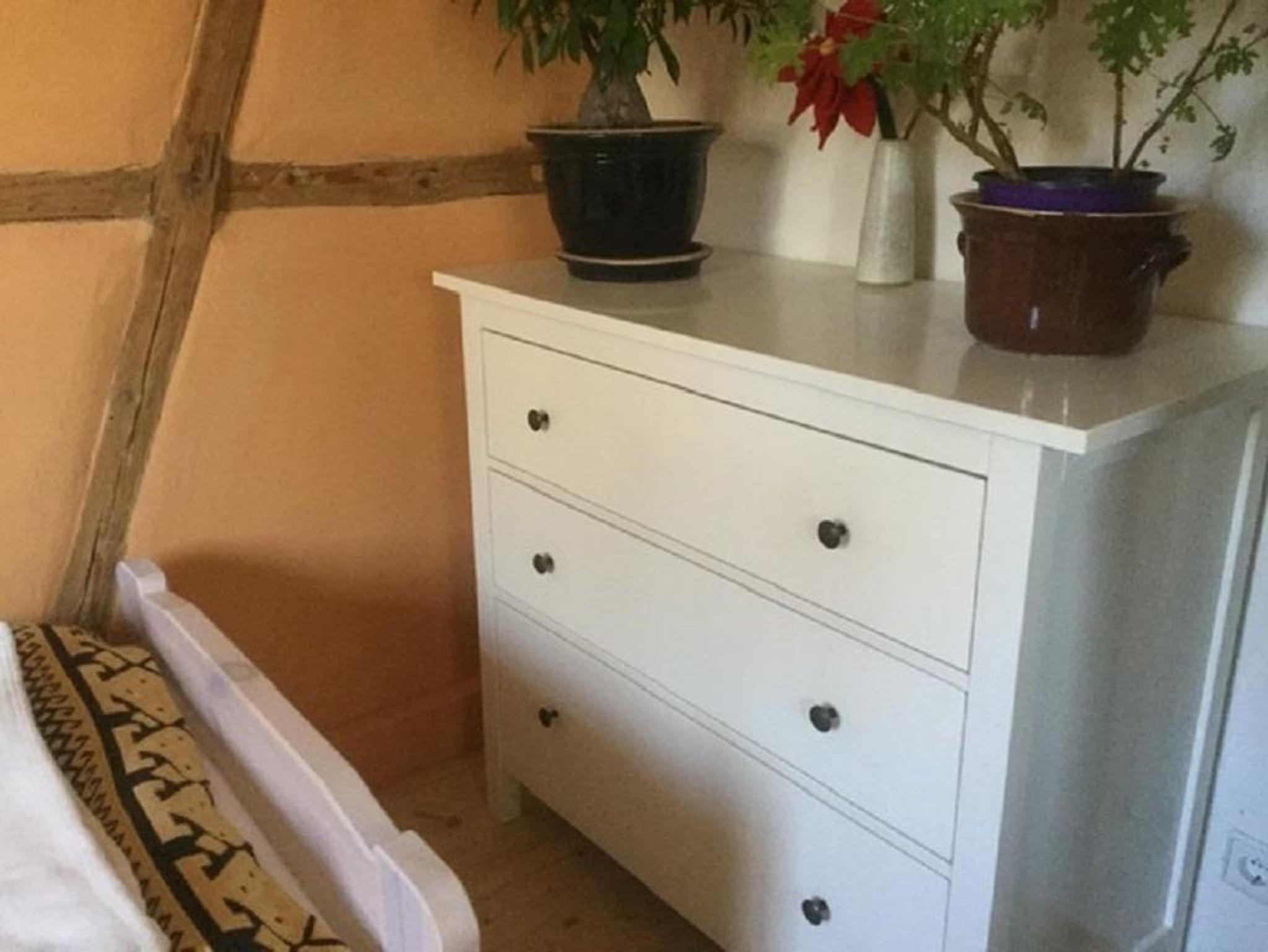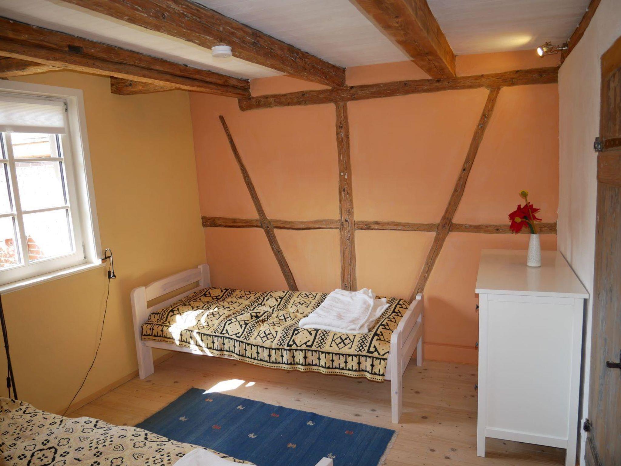 „Bachmanns Witwe“ ist eine kleine Ferienwohnung mit 28 m² für zwei Personen. Sie haben ein Schlafzimmer mit zwei einzelnen Betten und einen Wohnraum mit Sitzplatz, Miniküchenzeile mit Kochfeld und Kühlschrank sowie einen Schrank voller Kochutensilien, Kaffe- und Teekanne, Geschirr und Besteck. Zu Ihrer Verfügung stehen Toaster und Wasserkocher sowie ein Radio.