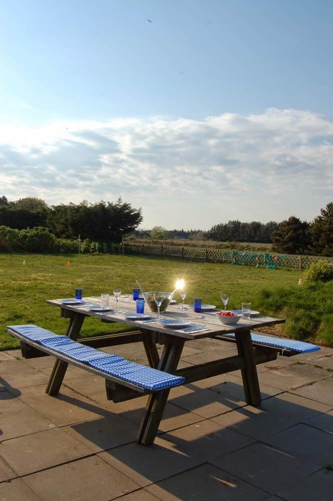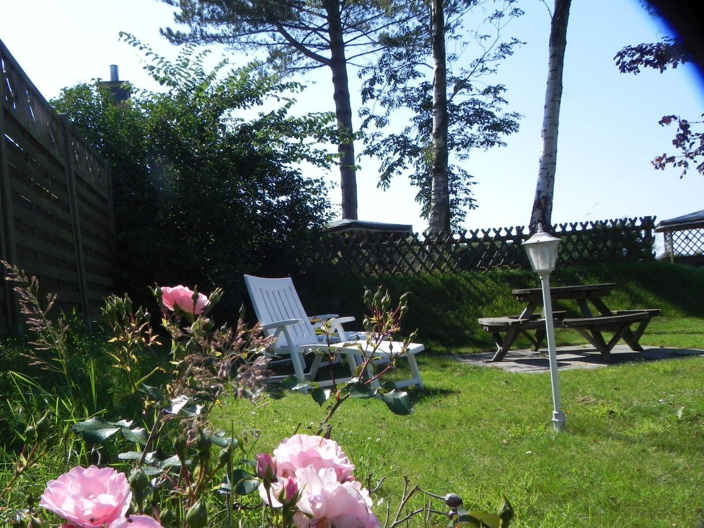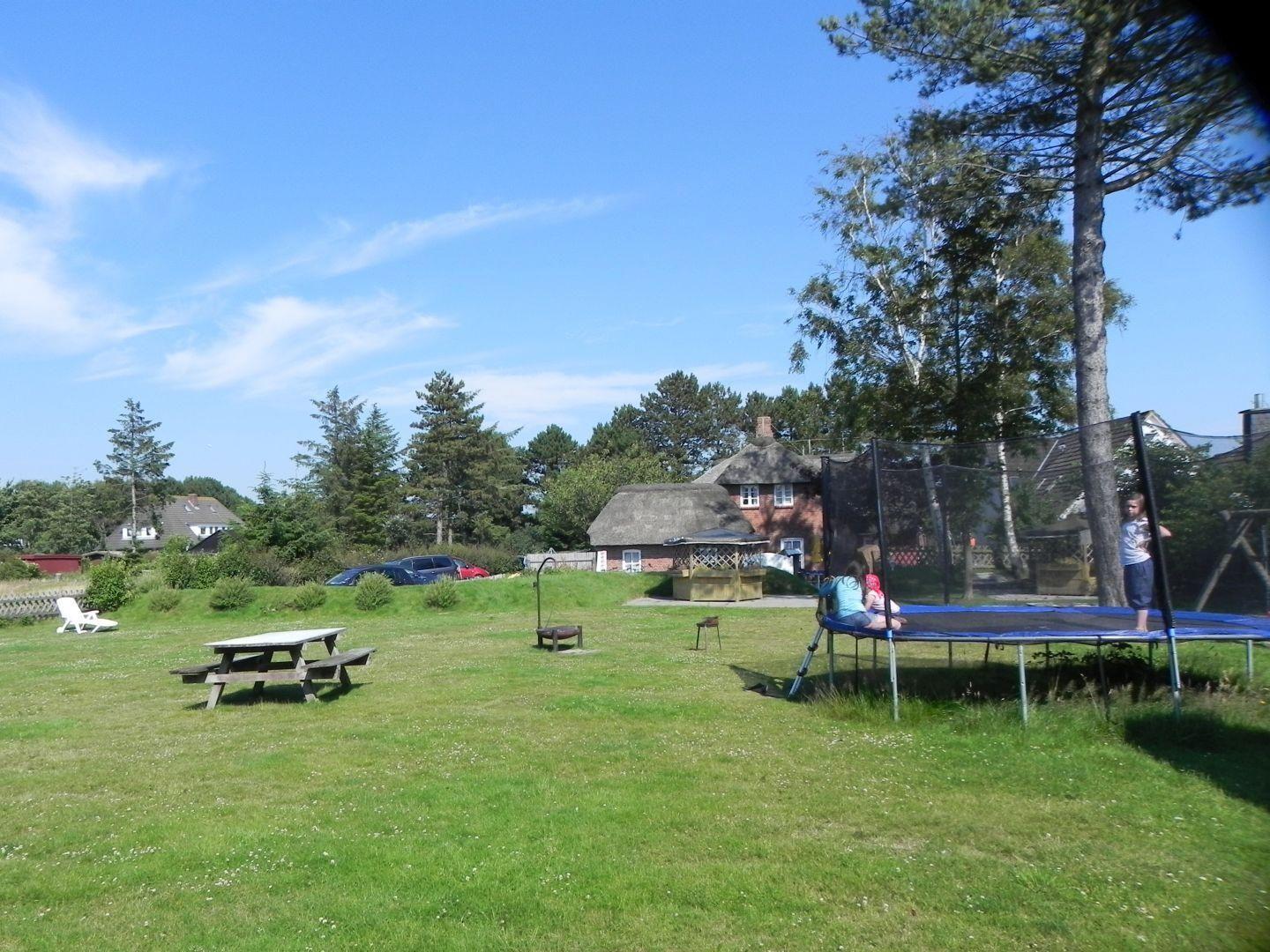 Das besondere Highlight der Ferienwohnung ist der riesige Garten: Hier gibt es mehrere weitere Sitzplätze, Sonnenliegen, ein Badewannenbett und die „Sundowner-Lounge“ mit schönem Blick über die Felder in den Sonnenuntergang. Außerdem diverse Spiele & Spielmöglichkeiten für Kinder & Erwachsene: Riesen-Trampolin, Grillplatz, das Wurf- und Geschicklichkeits-Spiel ‚Corn Hole‘, Schaukel und Sandkiste, und Amrums erstes Outdoor-Scrabble!