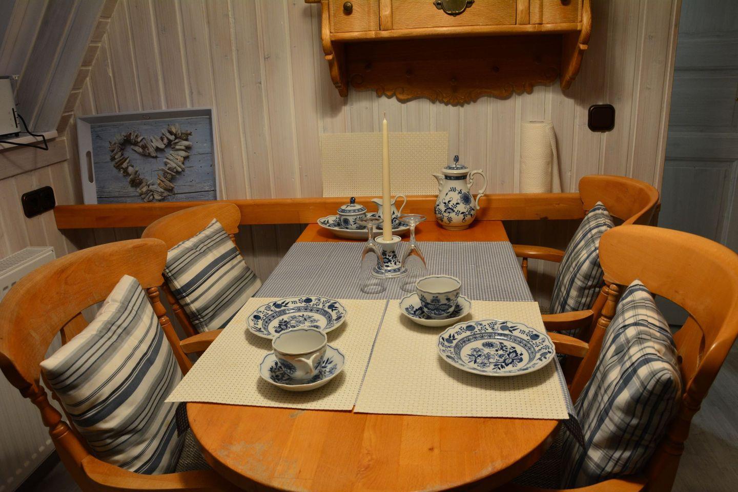 Stilvolle Wohnung für bis zu vier Personen im Obergeschoß des Hauses mit gemütlicher Einrichtung und zwei kuscheligen Schlafzimmern und modernem Duschbad. Vom Wohn / Eßzimmer erreichen Sie die beiden Schlafzimmer über eine Raumspartreppe. Die gemütliche Essecke mit Friesenporzellan lädt zum Genießen ein.