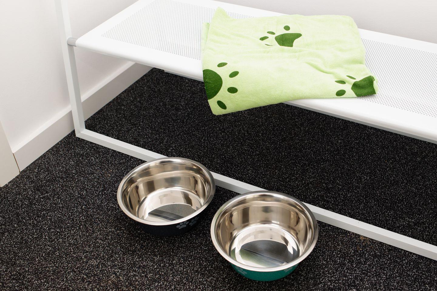 Für Ihren vierbeinigen Freund stehen Fressnäpfe und ein Handtuch für die nassen Pfoten bereit.