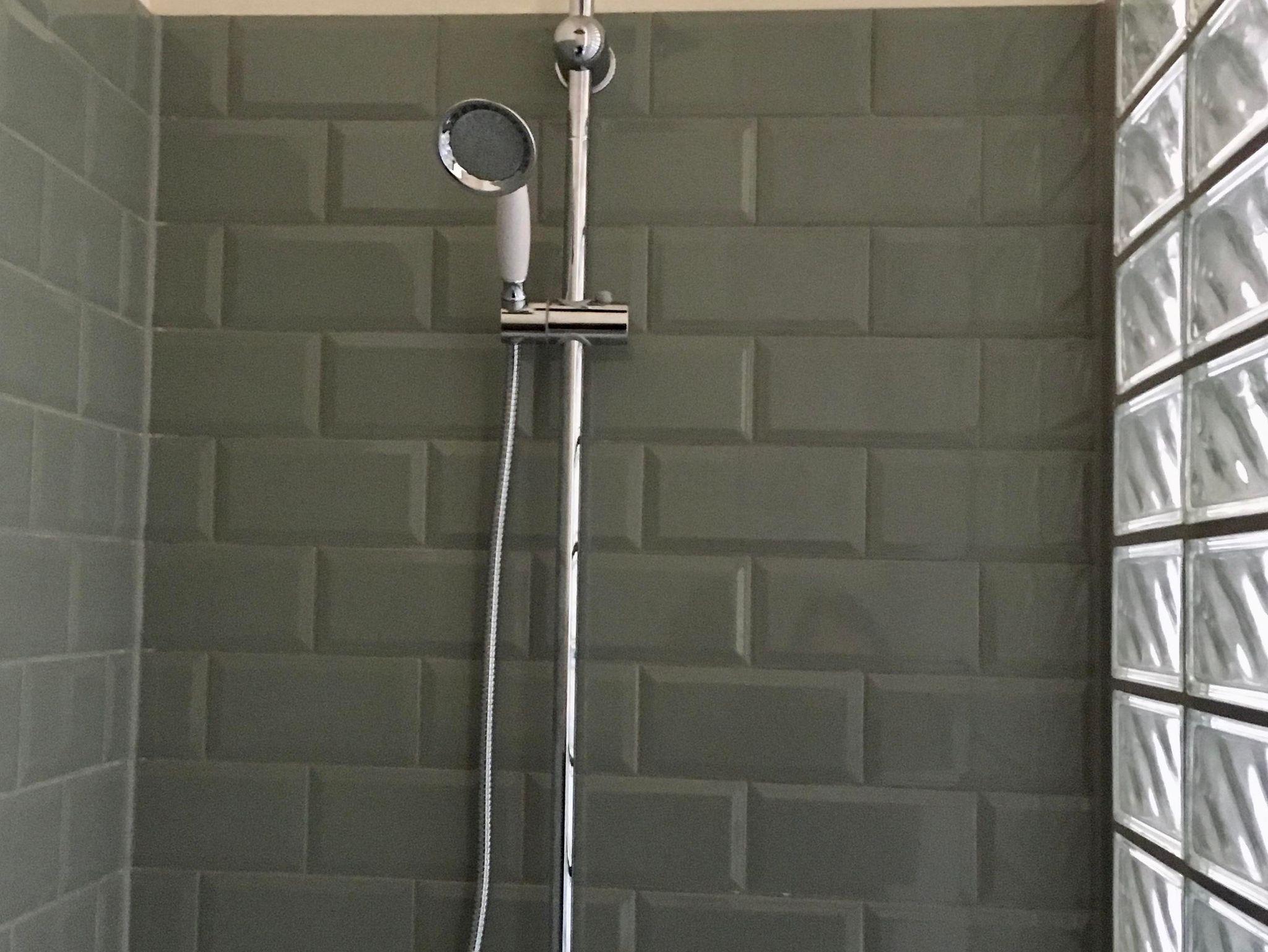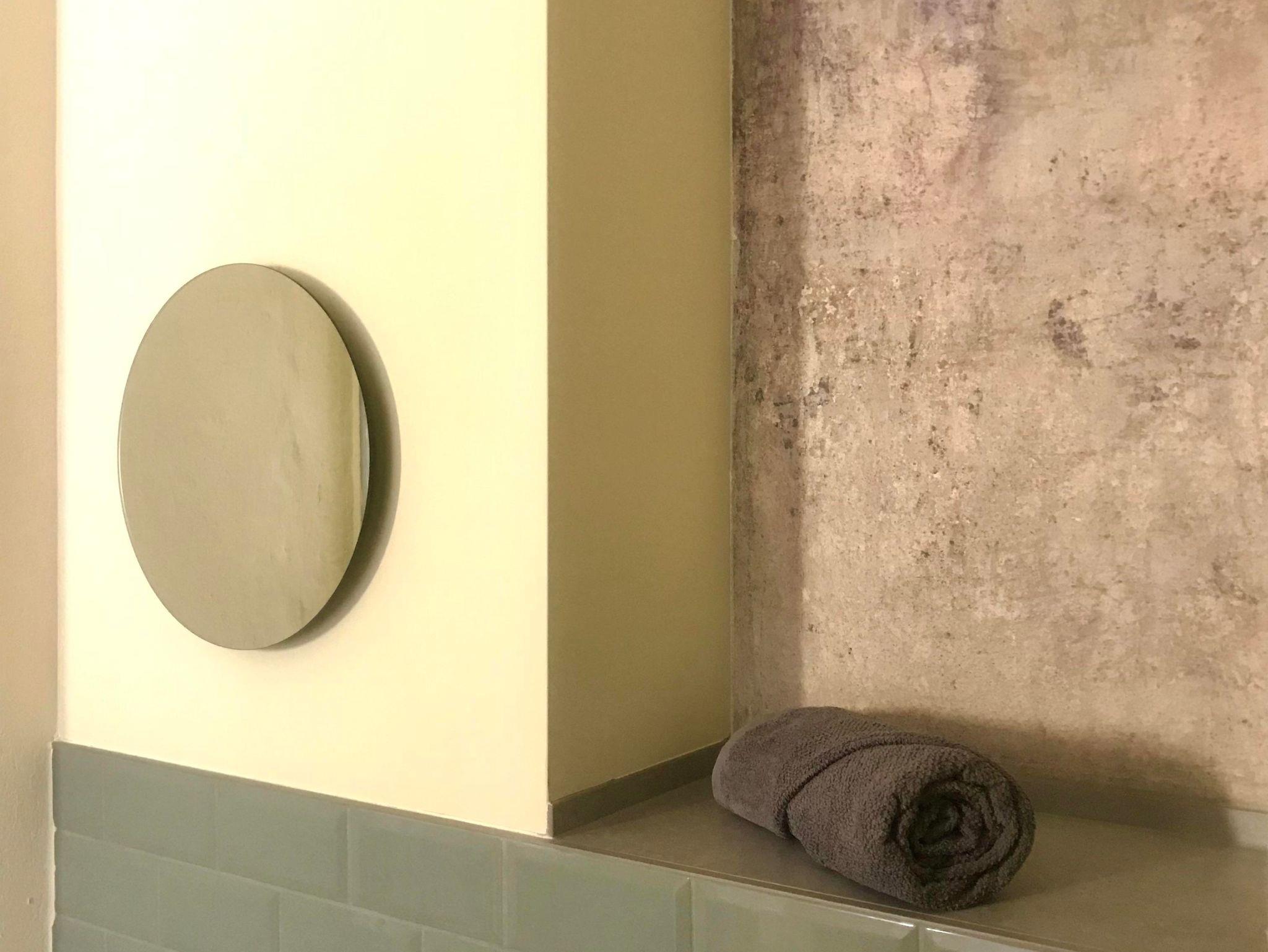 Das integrierte Duschbad glänzt in hellgrün-chrom und ist durch eine raumhohe Glasbausteinwand abgetrennt. Eine individuell gestaltete Garderobe bietet Ihrem Urlaubsgepäck auch für mehrere Tage Platz.