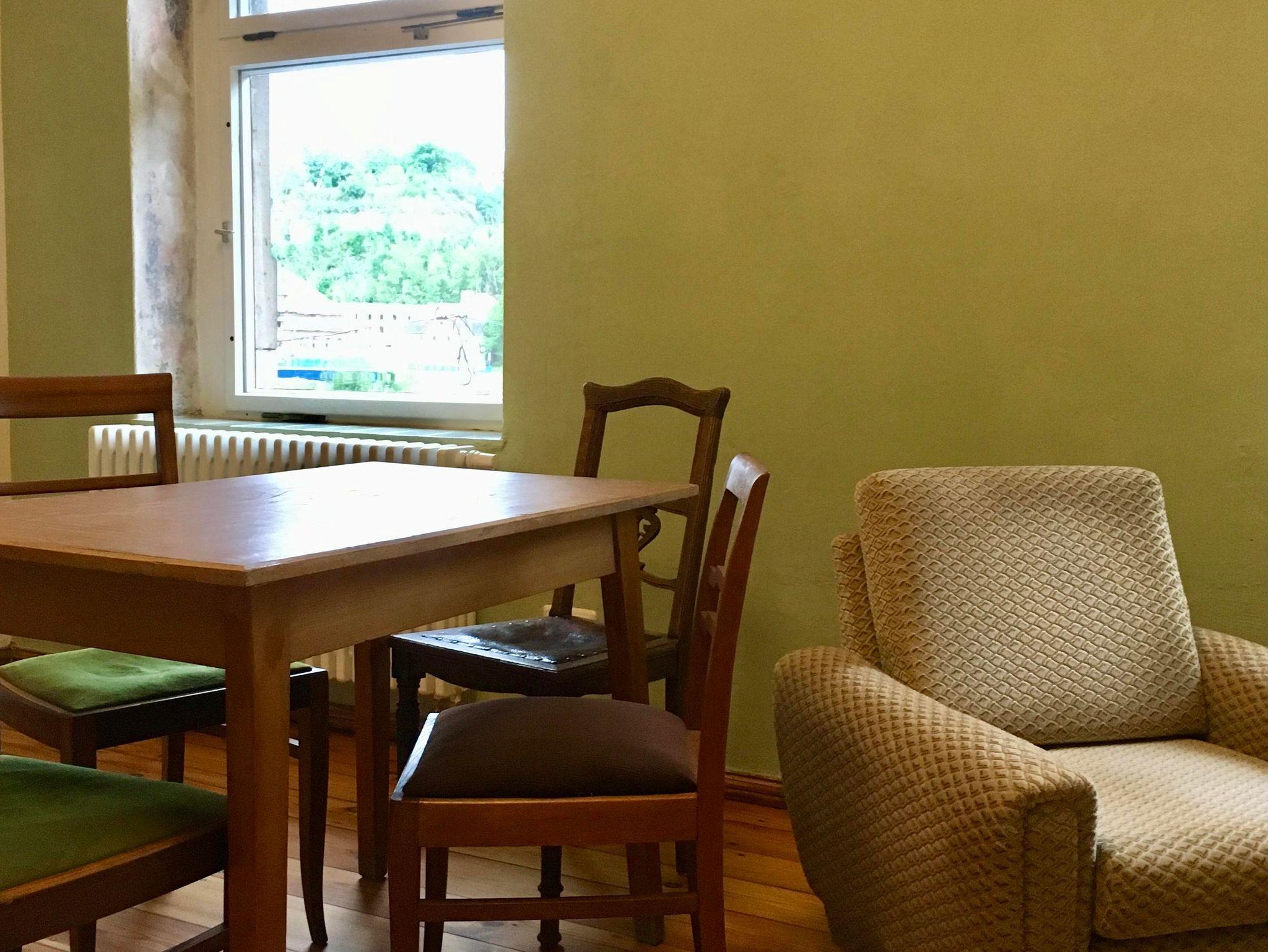 Der ehemalige Wartesaal kann auch als Seminar-/ Workshop-Raum angemietet werden. Das Bahnhofsgebäude wird schrittweise weiter hergerichtet, wovon jedoch weder Baulärm noch anderweitige Störungen ausgehen für Ihren Aufenthalt in der Idylle mit Stille.