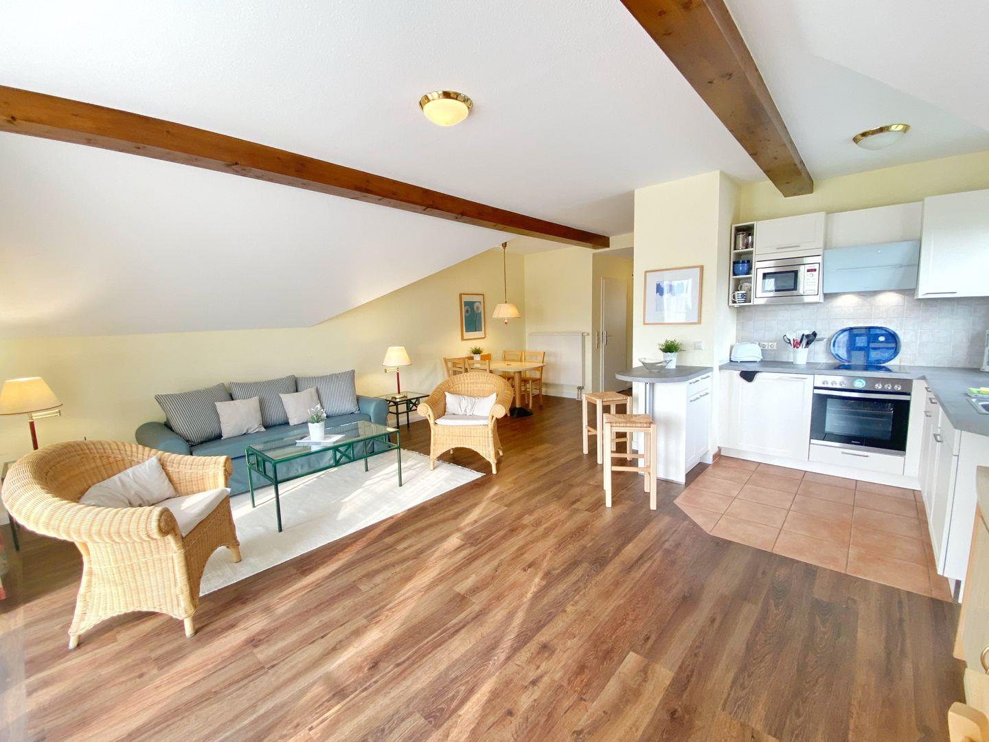Der großzügige und helle Wohnbereich mit einer gut ausgestatteten offenen Küchenzeile verfügt über einen Herd mit Backofen, einen Geschirrspüler, einen Kühlschrank mit Gefrierfach sowie eine Mikrowelle. Weitere Küchengeräte wie Kaffeemaschine, Toaster und Wasserkocher gehören natürlich zur Grundausstattung!
