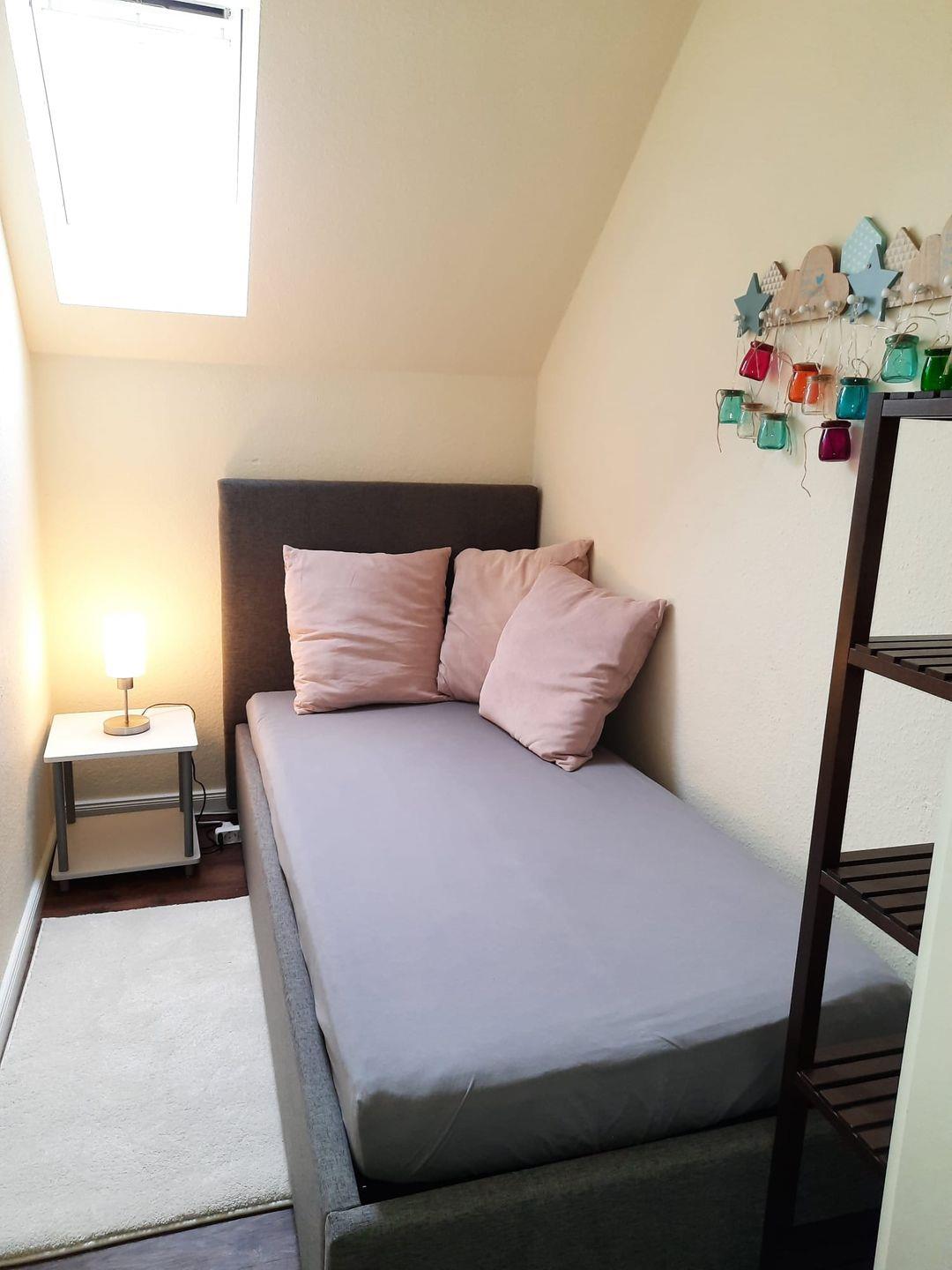 Das größere der beiden Schlafzimmer mit einem bequemen Doppelbett, zwei Nachttischen mit dazugehörigen Lampen und einem geräumigen Kleiderschrank mit Spiegeltüren bietet Platz für 2 Personen. Das kleine und niedliche Kinderzimmer verfügt über ein Einzelbett mit 0,90 m Breite. Ein Babybettchen ist vorhanden. Das Tageslichtbad mit Dusche und WC ist hell und modern.