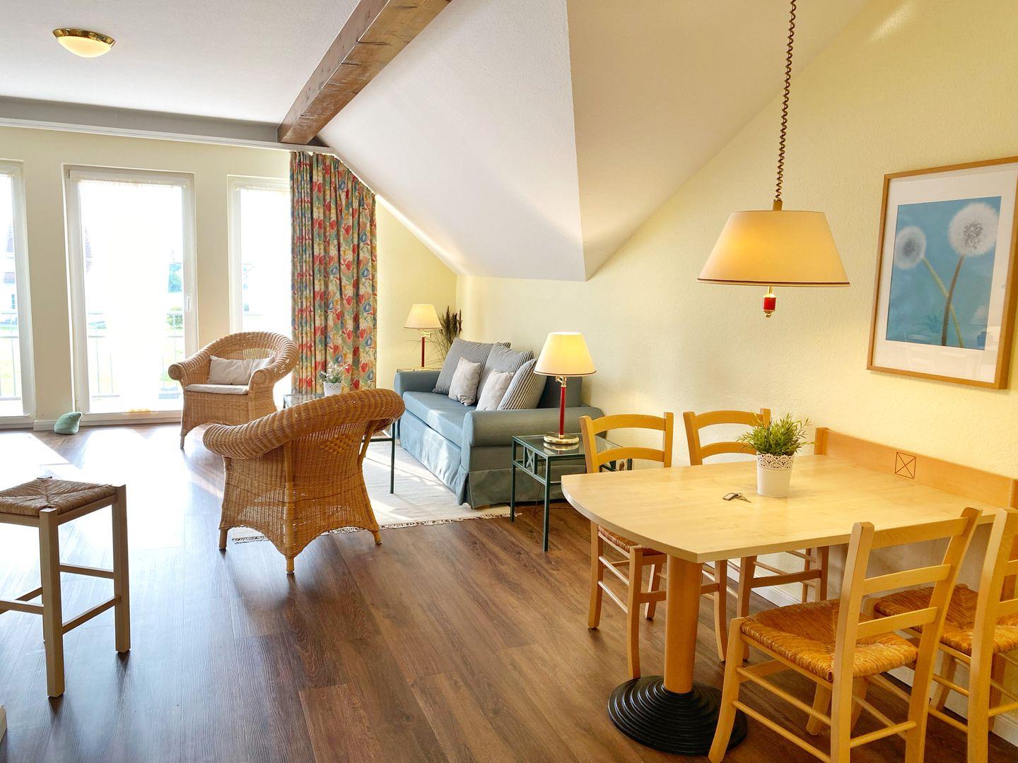 Die Couch der gemütlichen Sitzecke im Wohnzimmer bietet als Schlafcouch eine Schlafgelegenheit für 2 Personen. Über große bodentiefe Fenster gelangen Sie auf den Südbalkon. Verweilen Sie hier bei vielen sonnigen Stunden mit herrlichem Blick ins Grüne.