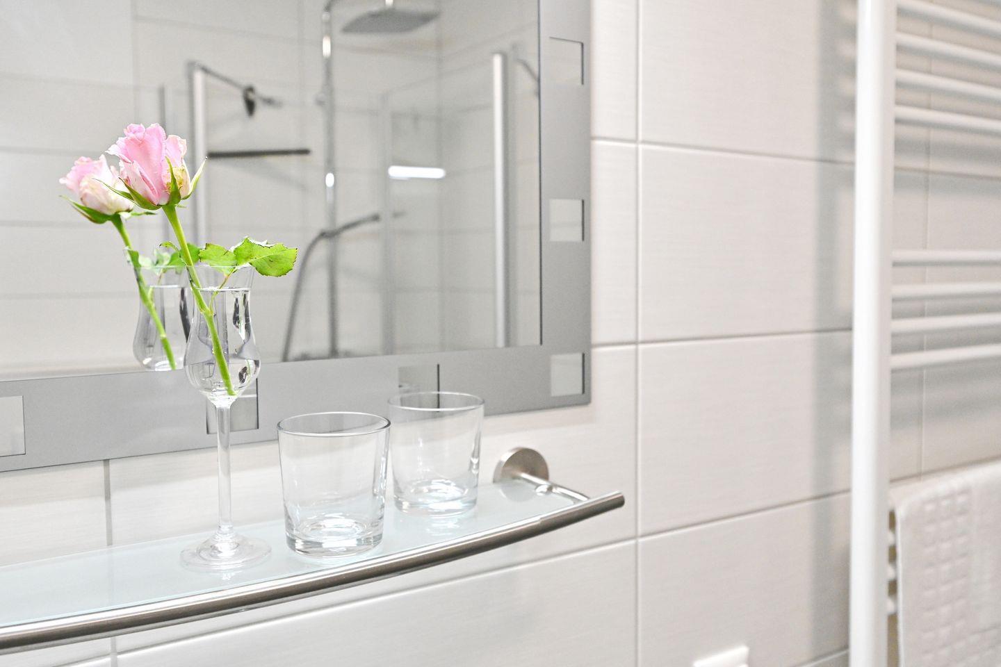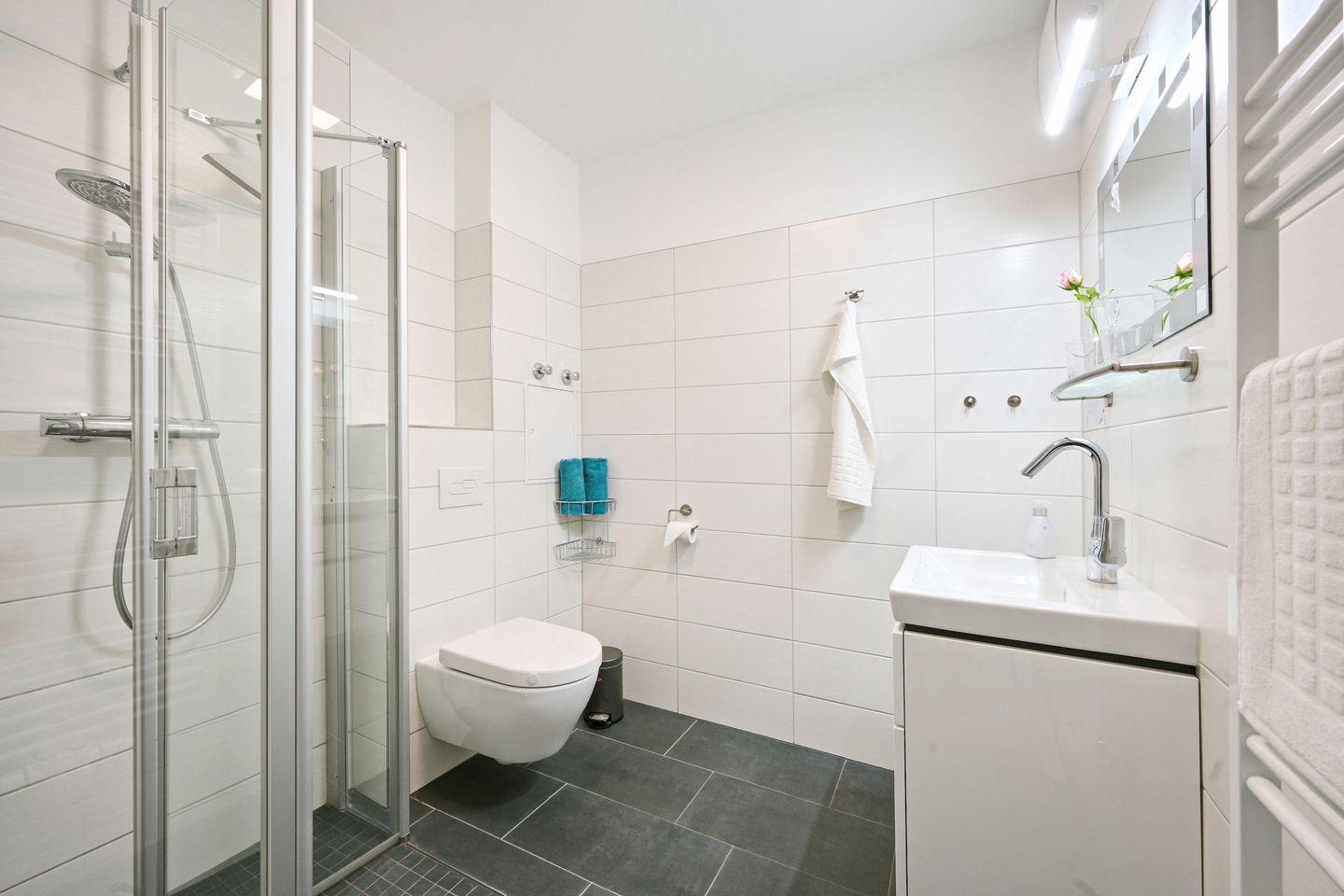 Das moderne Bad mit bodengleicher Dusche und WC ist hell und modern. Außerdem gibt es am Schlafzimmer noch ein separates WC mit Waschbecken.