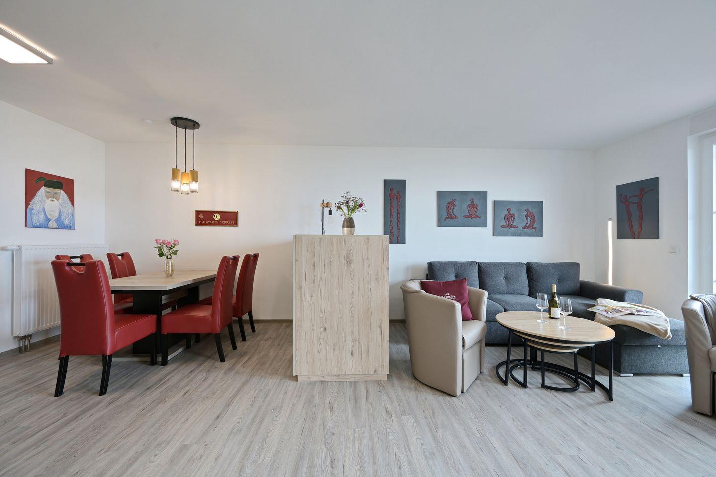 Im Schlafzimmer gibt es ein Doppelbett. Der großzügige und helle Wohnbereich bietet mit einer ausziehbaren Schlafcouch Platz für zwei weitere Schlafgäste. Neben der Couchecke mit Sesseln gibt es einen großen Esstisch. Die offene, moderne Einbauküche ist gut ausgestattet mit einem Ceranherd, Backofen, einem Geschirrspüler, Kühlschrank mit Gefrierfach sowie einer Mikrowelle. Weitere Küchengeräte wie Kaffeemaschine, Toaster und Wasserkocher gehören natürlich zur Grundausstattung!