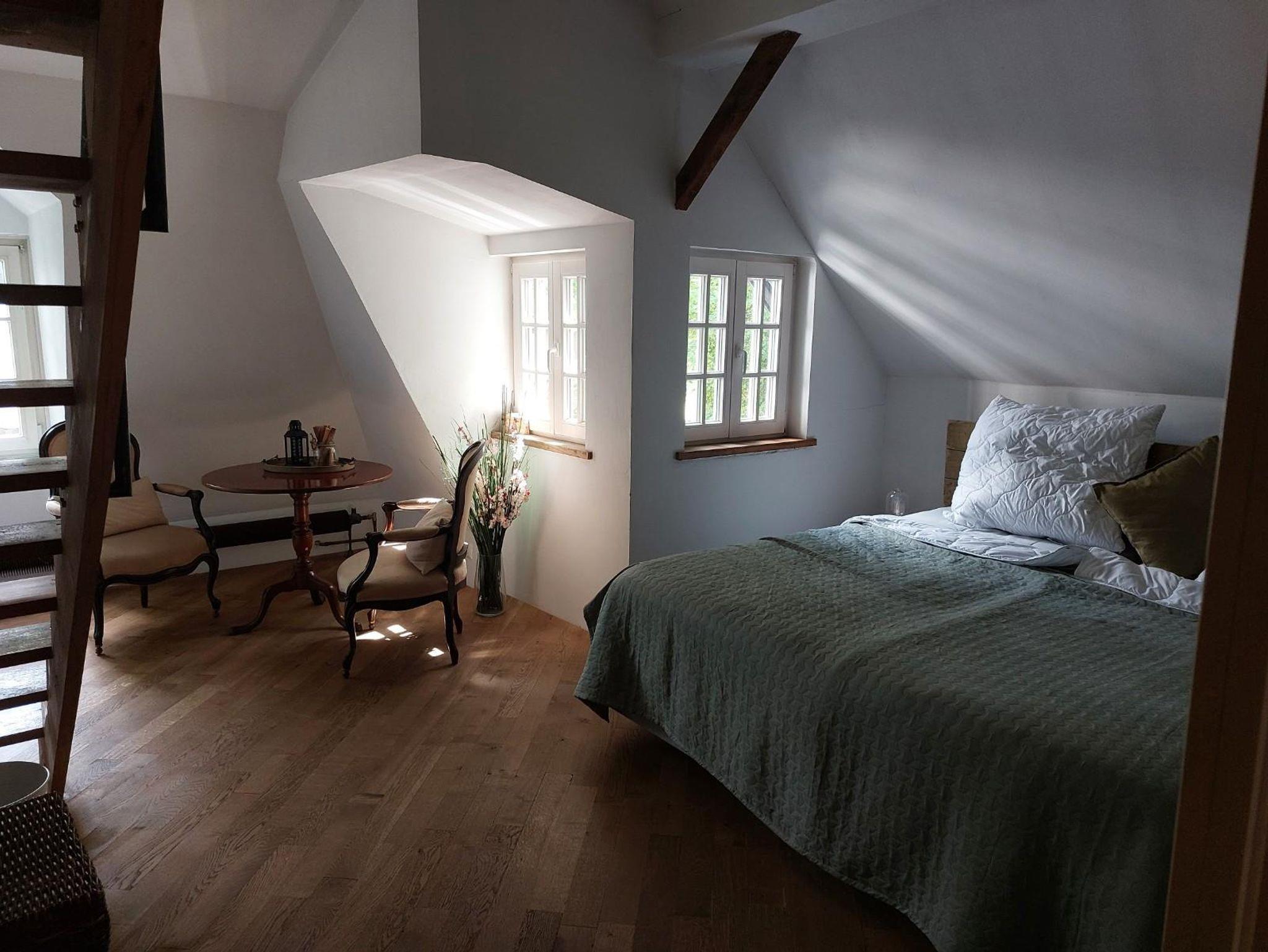 Jedes der drei Zimmer ist auch separat buchbar. Die Hochzeitssuite, das Lütte Appartment und ddas Maisonette Appartment. Zur Suite gehört ein weiteres Kaminzimmer, samt gemütlicher Couches, einer Bücherecke sowie einem Tisch, an dem Sie und Ihre Liebsten Gesellschaftsspiele spielen können. Abgehend von hier gelangen Sie in den Wohnbereich samt eigener, offener Küche und Wohn- Essbereich. Die zentrale Treppe führt nach oben ins Schlafgemach sowie in das moderne Badezimmer. Bis zu 6 Personen finden in der Suite Platz (Doppelbett 1,80x2,00m im OG; Schlafcouch und Einzelbett im EG)
