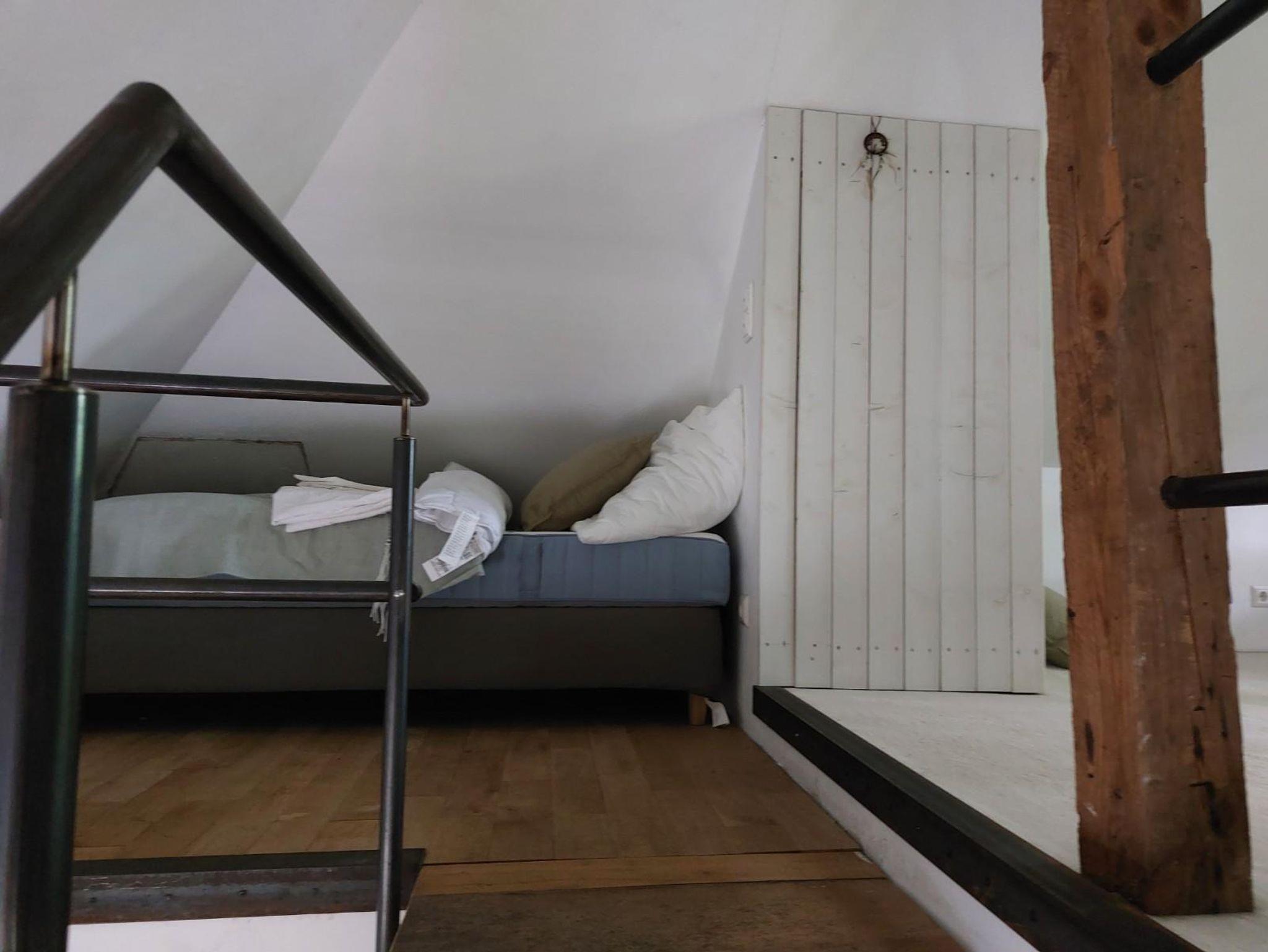 Das Ferienhaus bietet 3 Schlafzimmer mit jeweils einem Doppelbett. Von einem Schlafzimmer führt eine steile Treppe ins Dachgeschoss zur offenen Galerie mit weiteren drei Einzelbetten.