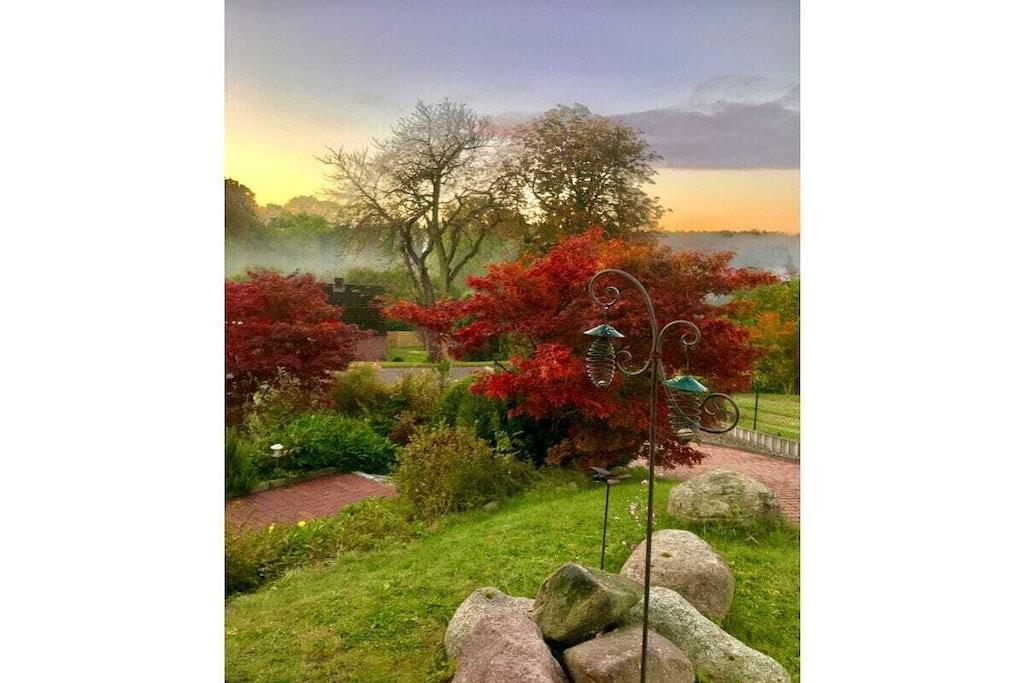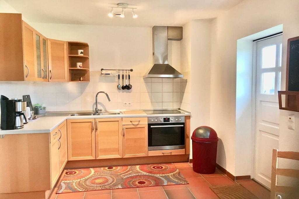 Den hyggelige, lyse lejlighed på 90 m² med separat indgang er højrefløjen i det skandinaviske træhus. Den strækker sig over to etager med et rummeligt køkken, gæstetoilet, åben stue-spisestue i stueetagen, to soveværelser og et komplet badeværelse (bruser og badekar, plus et andet toilet) på øverste etage. Den har også en åben hems/loft under taget med panoramaudsigt. På grund af den åbne beliggenhed på en bjergskråning, delvis udsigt over Muggesfelde-ejendommen og søen samt den åbne trætrappe er den ikke tilgængelig for kørestolsbrugere! Den private terrasse med havemøbler i teaktræ, liggestole og en Weber-grill ligger direkte i udkanten af marken; terrassen under asketræerne er perfekt til at nyde solnedgangen. Wi-Fi er tilgængelig til streaming med din egen enhed.