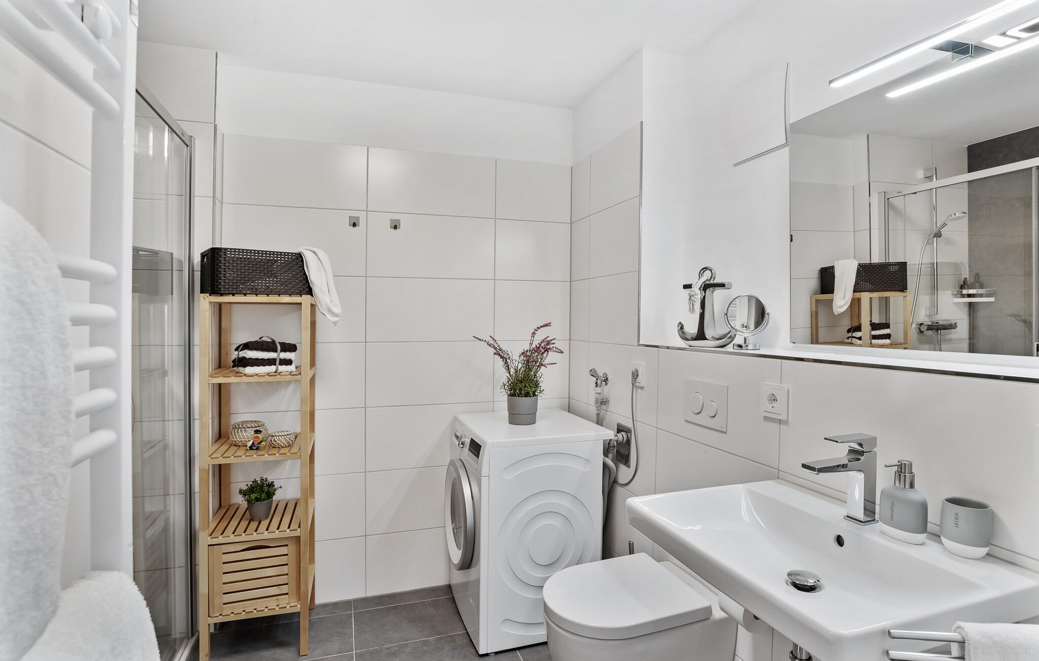 Mens I laver mad, spiser, læser avis eller bare hygger jer i det kombinerede, åbne køkken-alrum-alrum, følger udsigten over det brede vand jer konstant. I kan se gennem gulv til loft-vinduerne ud over altanen til sejlsportsbådshavnen, de flydende huse, østersøfjorden Slien og Slimünde fyrtårn. Et fænomenalt syn, der hele tiden er i bevægelse. I behøver faktisk slet ikke et tv, men NEPTUN tilbyder jer to: en i stue/spisestue og en i soveværelset. Der er også en lille samling af bøger og spil, så alle dage med dårligt vejr ikke ses negativt, men simpelthen er sjove. Og for musikelskere er der en internet-kompatibel Bluetooth-radio tilgængelig.