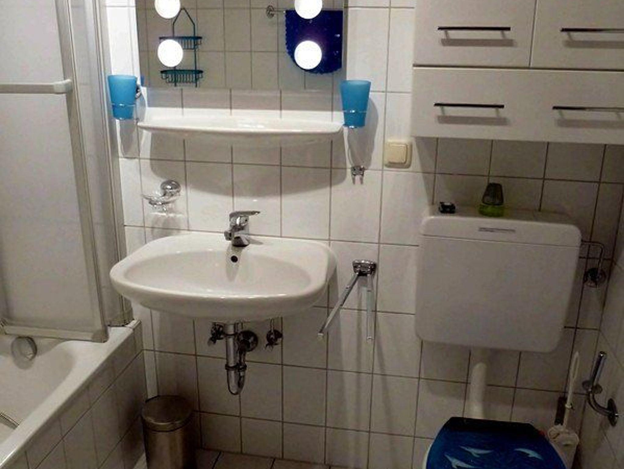 Bad und Gäste- WC sind modern gefliest und eingerichtet.