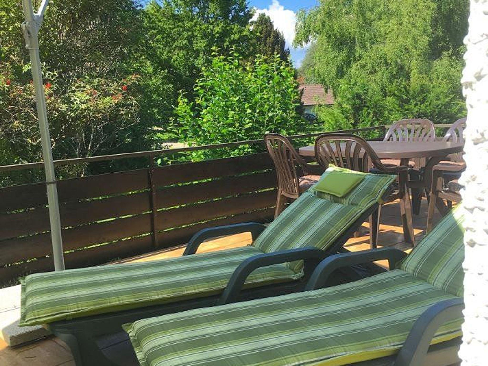 Sonnenliegen sind ebenso wie Gartenmöbel natürlich vorhanden.
