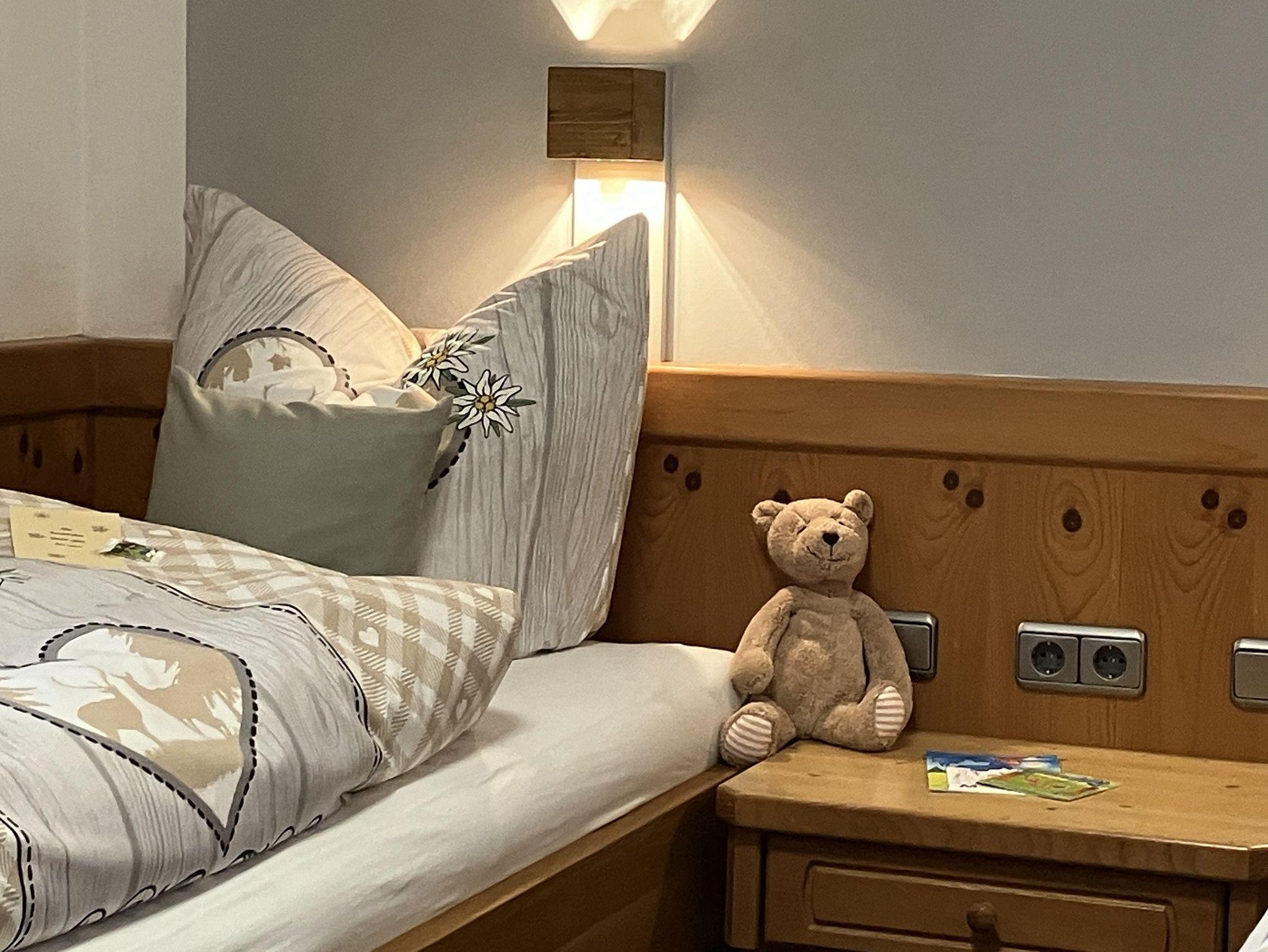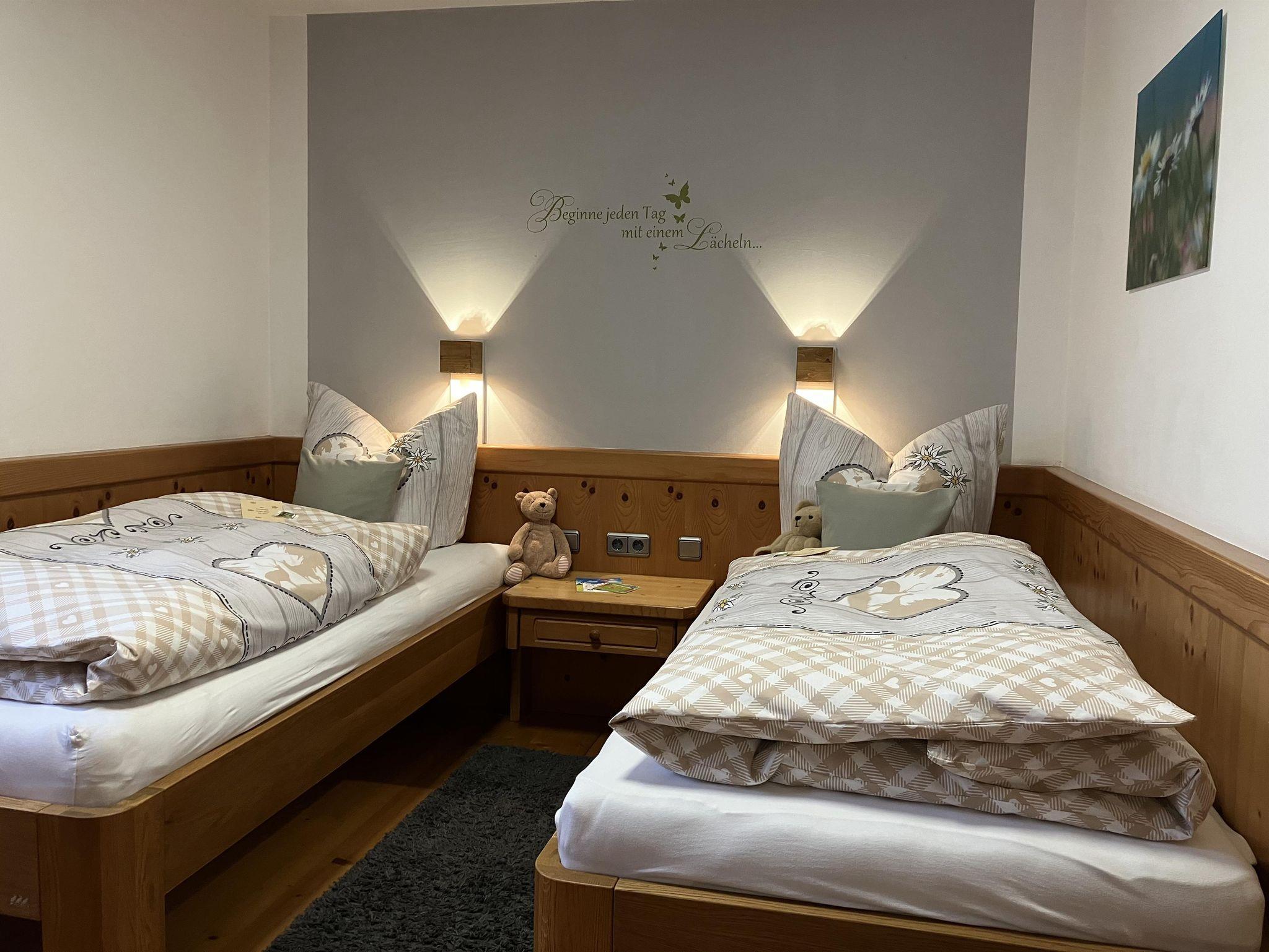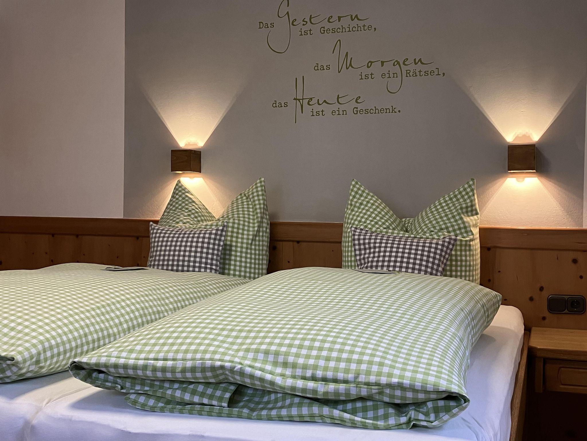 Gemütliche 3-Zimmerferienwohnung Alpspitz (84 qm) mit eigener Terrasse inklusive traumhaftem Bergblick, 2 separaten Schlafzimmern, einer großräumigen Wohnküche, einem schönen Badezimmer sowie einem separaten WC. Die im ländlichen Stil eigerichtete Wohnung ist mit Radio und TV sowie kostenlosem Wlan ausgestattet. Brötchenservice. Die komplette Baby und Kleinkindausstattung ist kostenfrei. Im Schlafzimmer mit den 2 Einzelbetten befindet sich ein weiteres Sofabett. Somit Schlafmöglichkeit für insgesamt 3 Personen in diesem Zimmer.