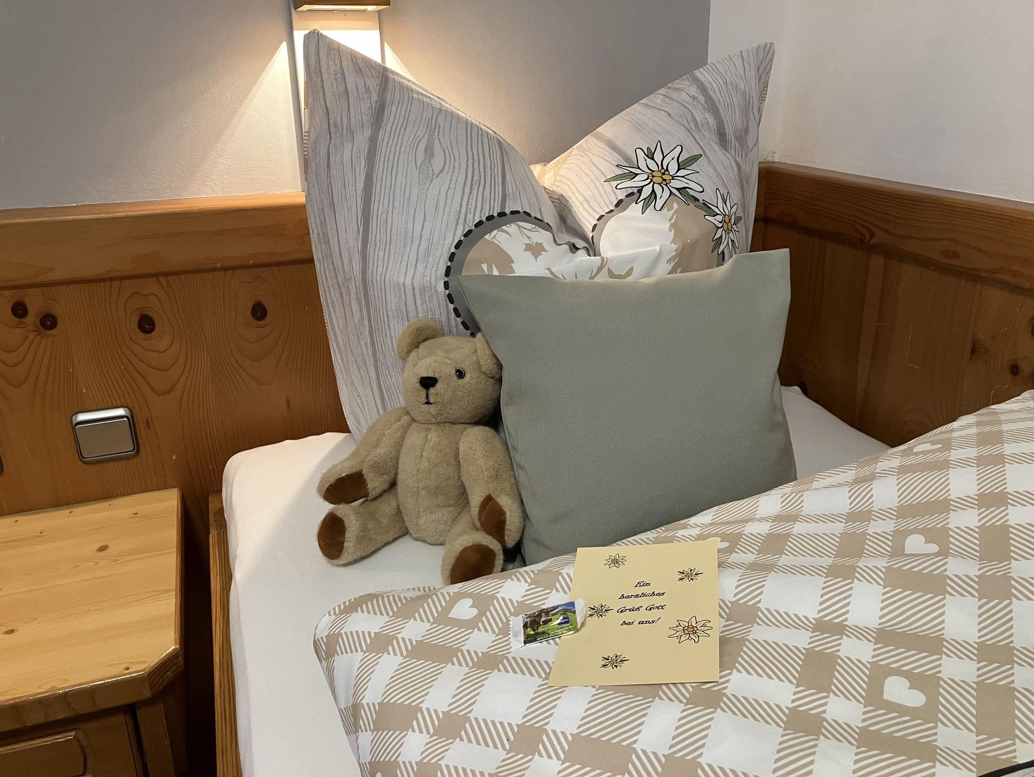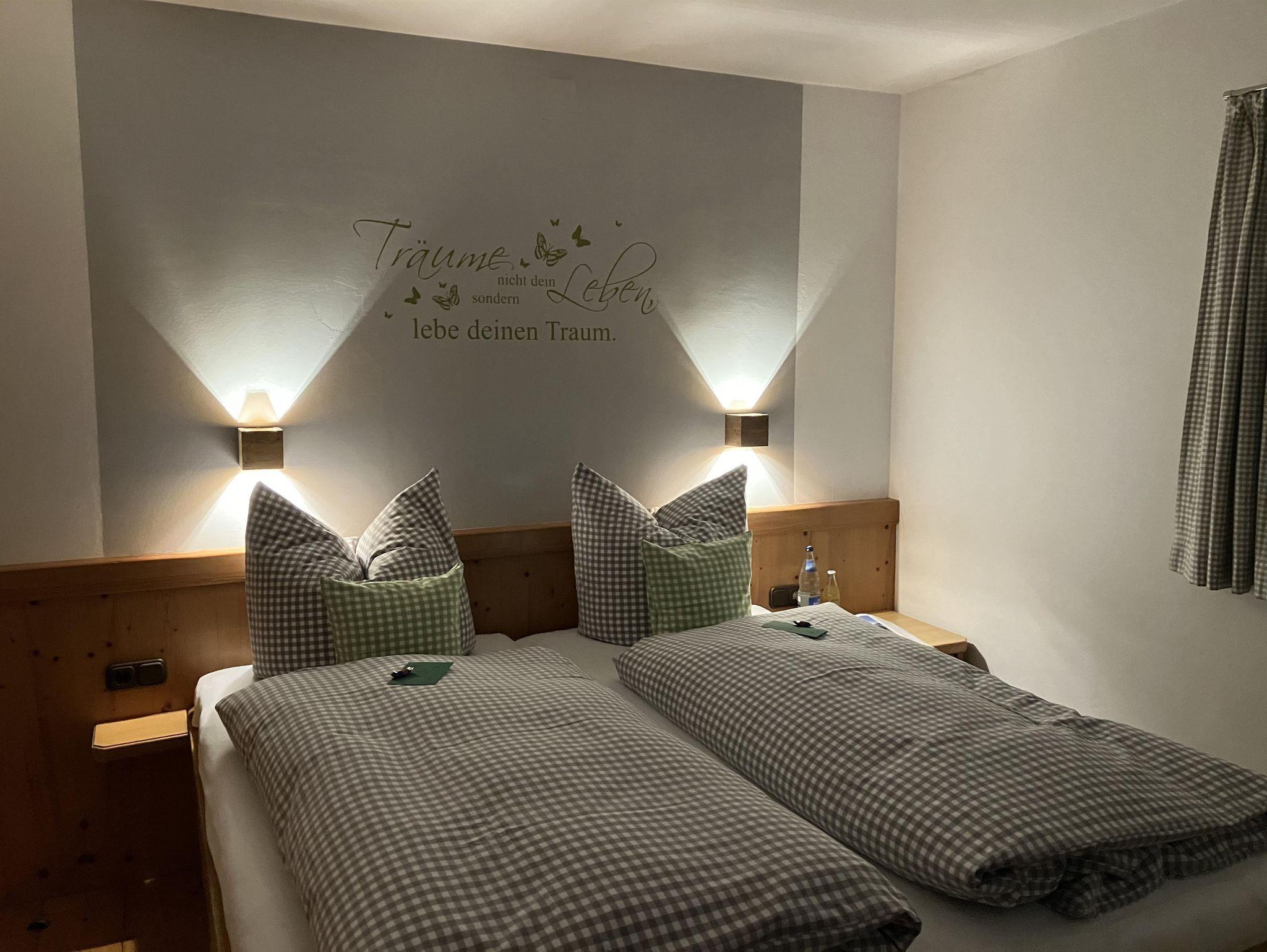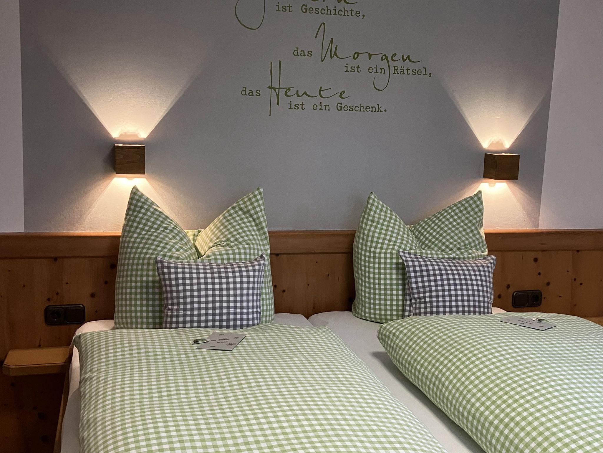Gemütliche 3-Zimmerferienwohnung Alpspitz (84 qm) mit eigener Terrasse inklusive traumhaftem Bergblick, 2 separaten Schlafzimmern, einer großräumigen Wohnküche, einem schönen Badezimmer sowie einem separaten WC. Die im ländlichen Stil eigerichtete Wohnung ist mit Radio und TV sowie kostenlosem Wlan ausgestattet. Brötchenservice. Die komplette Baby und Kleinkindausstattung ist kostenfrei. Im Schlafzimmer mit den 2 Einzelbetten befindet sich ein weiteres Sofabett. Somit Schlafmöglichkeit für insgesamt 3 Personen in diesem Zimmer.